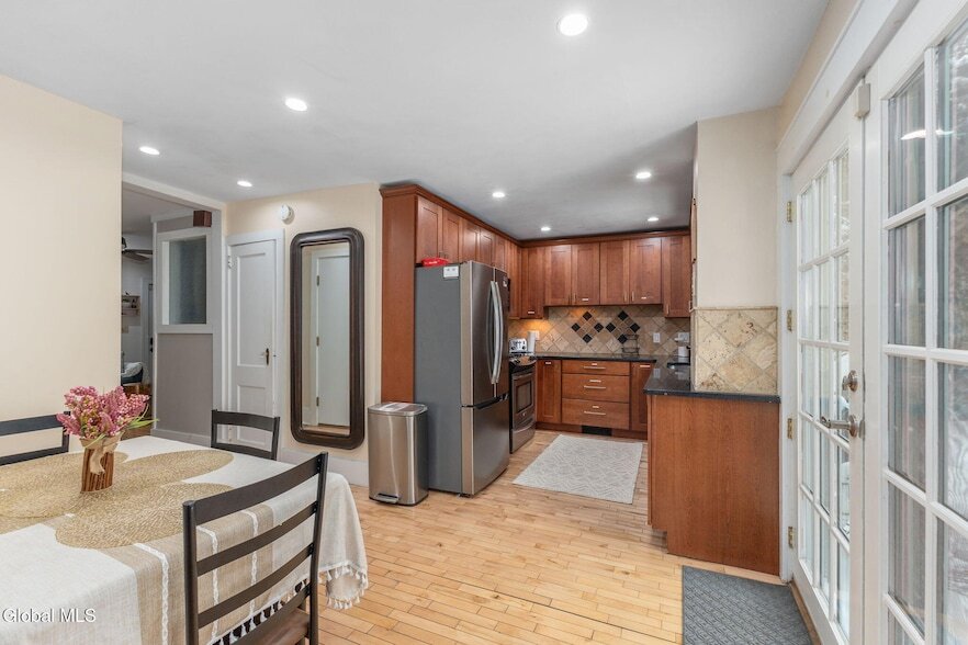 Enjoy stylish city living in the heart of Center Square, just half a block from the beauty of Washington Park. This charming 2 story brick brownstone with attached garage and delightful walled courtyard patio offers upscale chic living in Albany's premier neighborhood. Step inside and you're welcomed by hardwood floors and a stylish updated interior full of wonderful architectural details. Whip up delicious meals in the stunning kitchen featuring cherry cabinets, granite counters, newer stainless steel appliances and beautiful custom tiled backsplash. Gather around the table in the dining area or throw open the french doors to dine alfresco on the secluded walled patio out back. Or if you prefer, unwind with a cool drink on the upstairs balcony.The layout offers maximum flexibility with a first-floor living room plus den or office, and a further spacious family room plus 2 bedrooms upstairs. Two full bathrooms make daily routines manageable and you'll love the convenience of the 2nd fl laundry. Keep comfortable year round with forced air heat and central air cooling. Keep your vehicle safe in rare one car garage attached to the home. Enjoy life in the heart of Albany - just a short walk to some of the city's best dining & attractions plus Albany Medical Center and the Empire State Plaza & Capitol Building. No pets. No smoking. Tenant pays: electricity, heat, hot water, internet, snow removal & trash collection. Limited showing schedule on Wednesday afternoons & Thursdays all day. Application through RentSpree ONLY. Applicants must have a minimum 650 credit score and monthly income of at least $6,900.