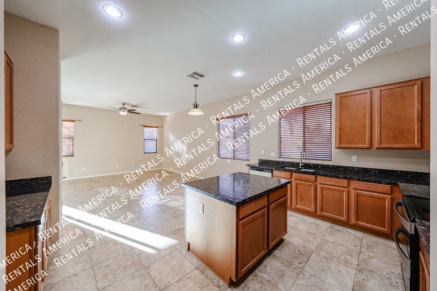 Move-in ready single-level home in the desirable West Wing Subdivision. This home offers an open floor plan with tile flooring, separate living and family rooms, 4 bedrooms plus a den, and a split layout for added privacy. The kitchen features granite countertops, stainless steel appliances, and maple cabinetry. A refrigerator can be provided if needed. Plantation shutters and wood blinds are featured throughout the home. The primary suite includes backyard access, dual sinks, a separate tub and shower, and a large walk-in closet. Enjoy low-maintenance desert landscaping, an RV gate, and a backyard grill (grill may not be operational). One Time Admin Fee: $300, Pet Deposit: $300/pet (if applicable), Service Fee: 2%. $39/month Resident Benefits Package, Helping Heroes Discount Available! Cats Allowed Ceramic Tile Disposal Dogs Allowed Dryer Garage Pets Allowed Vinyl Washer
