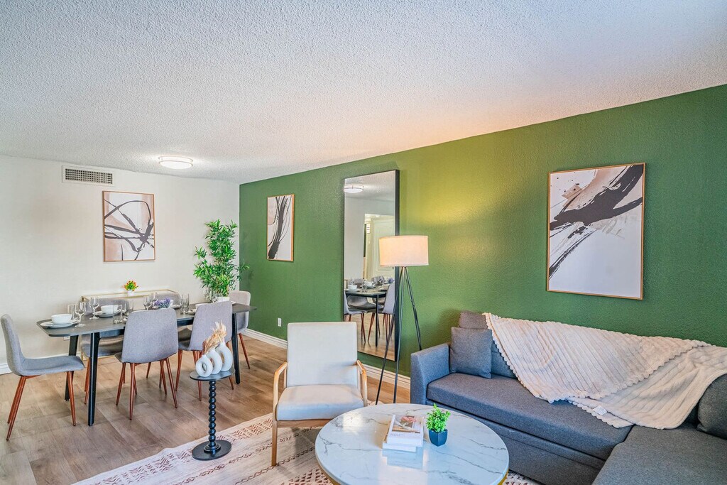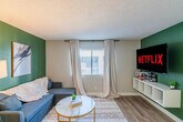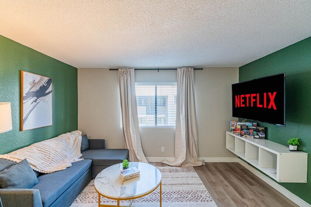 Experience serenity and feel at home in this modern 2-bedroom apartment in the heart of Scottsdale. Please note that there's one flight of stairs to walk up to the unit. The living space features an innovative open-concept design that blends the living and dining areas with the kitchen, creating a modern and sleek living experience. The fully equipped kitchen includes a microwave, stove, oven, refrigerator/freezer, dishwasher, toaster, coffee maker with coffee essentials, electric kettle, sink with hot and cold water, glasses, silverware, pots, pans, and a dining table with chairs. The bathrooms are completely private and stocked with essential toiletries, including a bath with a shower, wash basin, mirror, toilet, towels, hand towels, and washcloths. The living room features a sofa bed, chair, 4K 55" HDR smart TV, and coffee table. Parking is available on the premises, and instructions will be given at check-in. Pets are allowed depending on size or if they are service animals. To avoid having your reservation canceled, please inform us in advance and be honest about bringing a pet. An additional cleaning fee is required per pet: $20/night for 1-7 nights, $200 for 8-29 nights, and $300 for 30+ nights. Located in the southeastern part of Scottsdale, Arizona, this apartment offers a tranquil retreat in a peaceful residential neighborhood. Nature lovers will appreciate the proximity to El Dorado Park, while shopaholics and foodies will love the convenience of Scottsdale Waterfront, Scottsdale Fashion Square, and Tempe Marketplace, all within a short drive. With quick access to major highways, including Loop 101 and Loop 202, you can easily explore nearby attractions and reach downtown Phoenix. Enjoy cultural activities at the Scottsdale Museum of Contemporary Art and the Scottsdale Center for the Performing Arts. Explore the McDowell Sonoran Preserve, and you're perfectly situated between lively Tempe and downtown Scottsdale, ensuring a wide array of entertainment options. Quiet hours are between 10 pm and 8 am every day. If there are noise complaints or any violation of this rule, it may result in cancellation of booking and removal from the property without refund. There is a strict no-party policy; if there is a party of any kind, the police will be called and everyone will be removed from the property with no refunds. No unauthorized guests are allowed at the unit, and there is a $100 fine per guest if discovered. Smoking is prohibited without exception on this property; if any signs of smoking are found in the unit or on the premises, a fine of $500 will be imposed. If you are found to have brought pets without prior notification, there will be a $500 fee. There are noise monitors installed in the unit (it does not record sounds or conversations), it just measures the noise levels in decibels; if tampered with, there will be a fee. Security cameras are in the hallways for security. You may be charged extra for cleaning if the property is left in a state that necessitates additional cleaning. Lost or unreturned keys will incur a fee of $80 for key replacements and $150 for key fob replacements. For delayed checkout, there will be a $500 late checkout fee. Includes an office desk and chair in bedroom 1. [SI]