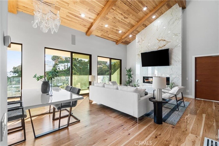 Perched above the legendary Sunset Strip, this 4,266 sq ft modern residence delivers breathtaking ocean views, inspired design, and high-end finishes in one of LA s most exclusive neighborhoods. This four-level architectural home seamlessly blends modern luxury with smart home innovation, offering the ultimate in elevated indoor-outdoor living.Inside, soaring 21.5-foot ceilings, floating LED-lit stairs, and a solar-powered skylight flood the main living space with natural light and dramatic volume. Hickory Natural hardwood floors run throughout, while oversized porcelain slabs accent three floor-to-ceiling fireplaces, the chef s kitchen backsplash, island, master bath walls, loft counter, and outdoor BBQ area.Enjoy sweeping ocean views from five of six bedrooms, the family room, chef s kitchen, rooftop deck, and even the heated saltwater pool. The luxurious primary suite features vaulted ceilings, a fireplace, dual walk-in closets, and dual spa-style baths for a true retreat experience.The lower level hosts four private en-suite bedrooms, each with sliding glass doors opening to expansive rear-facing decks with dramatic southern views ideal for guests, teens, or multigenerational living.A true entertainer s dream, the gourmet kitchen is outfitted with Sub-Zero and Wolf appliances, an oversized island, and generous cabinet space. The home is built to entertain featuring a rooftop deck, theatre, loft, and an outdoor kitchen with built-in BBQ and panoramic views.Designed for effortless indoor-outdoor living, eight Fleetwood sliding doors open to limestone-paved exteriors, a heated saltwater pool and spa with LED lighting, solar landscape lighting, and two NEMA 14-50 EV charging outlets. Seven steel-framed mahogany pivot doors including the main entry and six bedroom entries add warmth and elegance to the home s sleek modern aesthetic.Smart home systems control lighting, fireplaces, pool, irrigation, security, theater, and climate all from your fingertips.A rare opportunity to own a custom-crafted modern home with luxury finishes, iconic views, and seamless indoor-outdoor flow minutes from the Sunset Strip, yet a world apart.