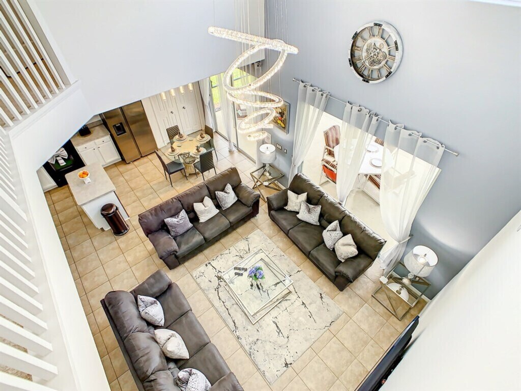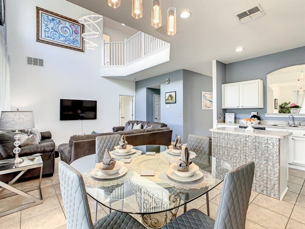 Experience the perfect getaway at this luxurious 7-bedroom villa in the Emerald Island Resort, Kissimmee. This spacious 2881 sq. ft. home comfortably accommodates 14 guests with 10 cozy beds, including 2 king-size beds, 2 queens, and 6 twins. Enjoy the large private pool and spa, outdoor TV and dining, a fun game room, and resort-style amenities like a clubhouse, Tiki bar, gym, and tennis courts. Located just 10 minutes from Disney, it’s your ideal vacation retreat for family and friends! Relax in the open-concept living room with plush seating, high ceilings, and plenty of natural light. The elegant decor and large TV make this the perfect spot to unwind after a day of exploring. The villa offers a variety of sleeping options for up to 14 guests, including a master suite with a king-size bed and ensuite bathroom downstairs, and additional bedrooms with king, queen, and twin beds upstairs. The fully equipped kitchen includes modern appliances, ample counter space, and everything you need to cook a meal for your group. Dine indoors at the elegant dining table or enjoy meals outdoors by the pool. Parking inside the resort requires a $20 non-refundable visitor access card per vehicle. Optional pool and spa heating is available for $35 per day plus tax and must be requested 7 days prior to arrival. The villa is just 10 minutes from Disney, making it a prime location for theme park enthusiasts. Across the street, visit Margaritaville and Sunset Walk for dining, shopping, a cinema, and a water park—perfect for a fun night out! The home features a Ring doorbell camera for security. Guests must be accompanied by a registered visitor to access resort amenities. Regular pest control and weekly pool and spa maintenance by licensed professionals ensure cleanliness and safety.