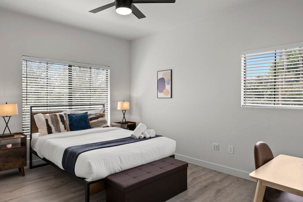 Feel at home in this brand-new condo in Chandler, perfectly situated near premier shopping, dining, entertainment, and a top-tier golf course in the Greater Phoenix area. Ideal for leisure travelers, snowbirds, spring training fans, and business guests, this condo offers the ultimate blend of comfort and convenience. Stairs may be required, as the property is not wheelchair accessible. This condo is perfect for families, groups of friends, or business travelers, offering everything you need for a comfortable and enjoyable stay. It features quartz countertops, stainless steel appliances, a fully equipped kitchen, sleek modern décor, high-speed 100+ Mbps internet, a Smart TV with streaming apps, a washer/dryer, complimentary coffee, and a private patio. Enjoy access to 2 resort-style pools, a jacuzzi hot tub, a fitness center, a large outdoor fireplace, a hammock garden, a BBQ area, a playground, and an on-site arcade. Pets are welcome with a fee of $100-300 based on stay length. Located in the heart of Metropolitan Phoenix, Chandler offers the perfect blend of an active lifestyle and endless opportunities for outdoor recreation. Enjoy family-friendly activities, award-winning events, world-class golf courses, and a lively downtown scene. Visitors to Chandler can savor diverse culinary experiences, explore premier shopping destinations, and immerse themselves in arts and culture. Conveniently situated near top attractions, it’s just a short drive or quick ride away from everything you need. All properties are smoke-free environments, and any sign of smoking is a violation of the stay agreement, which may result in immediate termination and recovery fees beginning at $500. There is a $500 penalty for removing smoke detectors. No weapons or drugs are allowed, and police will be called for violating this rule. Guests must agree not to disturb neighbors at all times during the stay and must observe quiet hours from 9pm-8am each day. Check-in is at 4 PM and check-out is at 11 AM, with a $75/hr late fee. No outside guests are allowed without permission. One towel is provided per guest per stay. A valid photo ID is required to complete the booking. A pet fee may be charged for guests traveling with an emotional support animal. To abide by all legal requirements and HOA rules, you will be asked to provide a copy of your official government-issued photo ID, confirm your contact information, and pass through our verification portal. Minimum age requirement of primary person booking should be 22 years old for out of town guests and 25 years old for local guests. [SI]