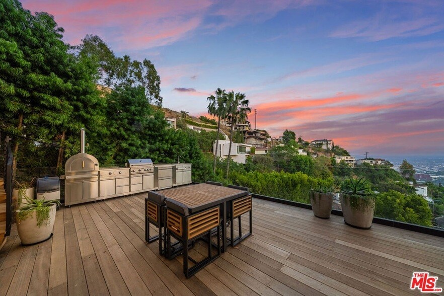 Newly remodeled down to the studs, this warm and modern zen retreat offers panoramic city views and wellness-focused amenities throughout. Step into this striking 4-bedroom, 4.5-bath contemporary masterpiece nestled in the heart of the Hollywood Hills where sleek design, serene living, and breathtaking vistas span across four thoughtfully designed levels. Wrapped in floor-to-ceiling glass, the home captures LA's skyline from nearly every room. Enjoy a private sauna, cold plunge, jacuzzi, and an outdoor kitchen complete with BBQ and pizza oven ideal for entertaining or recharging in style. Each floor offers thoughtfully designed spaces, combining privacy and elegance throughout. Every bedroom features its own en-suite bathroom, and the interiors boast sophisticated finishes and a serene ambiance. A secure 2-car garage ensures easy parking and added peace of mind. This home is a true retreat above the city designed for guests who crave beauty, comfort, and a front-row seat to the magic of Los Angeles. Coming soon: a private theater room and gym perfect for elevated living and entertainment.