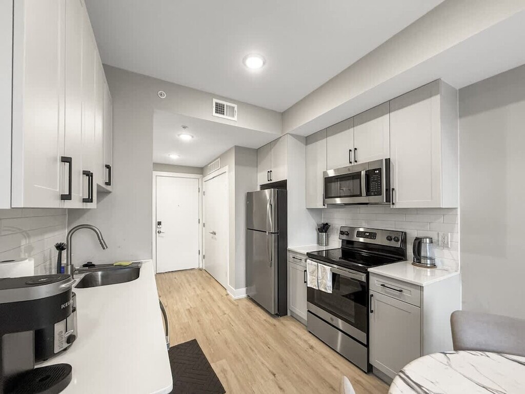 Discover your perfect home away from home in the heart of Philadelphia’s vibrant and historic district. This stylish and contemporary 1-bedroom apartment is designed to offer the ideal mix of comfort and convenience for an unforgettable stay. Unwind in the tranquil bedroom featuring a luxurious queen-size bed with high-quality linens and plush pillows. There’s ample closet space for your belongings, and a comfortable desk and chair are provided for productive work sessions. The stylish living room offers a comfortable sofa bed that easily converts to a bed, providing additional sleeping space for guests. Its chic design ensures a cozy and inviting atmosphere for all. Cook and dine with ease in the modern kitchen, equipped with top-of-the-line stainless steel appliances, including a refrigerator, oven, stove, microwave, and dishwasher. Everything needed for a smooth cooking and cleanup experience is at your fingertips. The contemporary bathroom features elegant décor with clean lines and high-quality finishes, creating a serene and refreshing space for relaxation. Pets are allowed depending on size. The following additional per pet cleaning fee applies: 1-4 nights: $25 per night, 5-29 nights: $200, and 30+ nights: $300. Located in the heart of Philadelphia, this apartment combines style and functionality to make your stay both enjoyable and memorable, whether you're here for business or leisure. Surveillance cameras are in the hallways for security and a Minut device is in the unit for noise level. No shoes are allowed in the house and please do your dishes before leaving. No smoking is allowed. If there is evidence of smoking indoors, a $500 fine will be imposed. Ensure the shower curtain is kept inside the shower basin while showering to prevent water from spilling onto the floor. [SI]