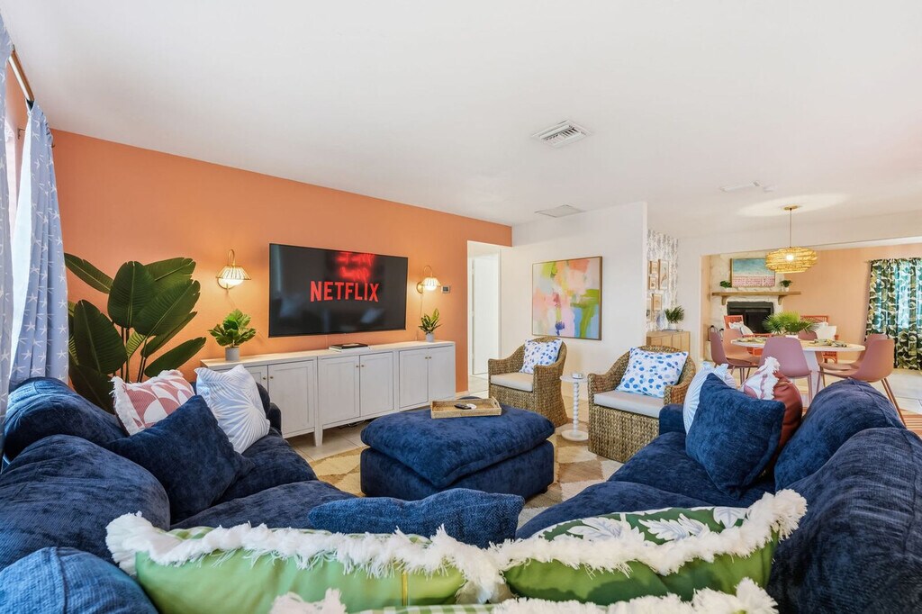 Feel at home in this 3-bedroom, 2-bathroom Seminole retreat, designed to host up to 8 guests in style and comfort. This home features bright and welcoming living spaces, a fully stocked kitchen, and a game room with a pool table, poker table, arcade games, and wall board games. Enjoy the heated private pool, tiki bar, hot tub, fire pit, putt putt, corn hole, giant connect 4 and Jenga, outdoor patio/dining, BBQ grill, and beach essentials. Each bedroom has a smart TV, and there is an indoor fireplace in the living room. Up to 2 dogs are allowed for $125 per stay. The heated pool is available for an additional fee of $100 per night and can be heated to about 20-25 degrees above the ambient temperature. At least a 3-day notice is required before arrival if you'd like the pool heated, and it must be heated for the entirety of your stay. Parking is available in the garage for a maximum of 2 cars. This home is just minutes from the Gulf Coast’s world-famous beaches, dining, and attractions. Nearby attractions include Florida Botanical Gardens, St. Pete Pier, The Dalí Museum, Great Explorations Children’s Museum, and Sky Zone Trampoline Park. Enjoy nearby restaurants such as Salt Rock Grill, Angry Pepper, Clear Sky on Park, Tripps Diner, and Mama’s Kitchen. The beaches of Indian Rocks Beach, Madeira Beach, Redington Shores, Treasure Island Beach, and Clearwater Beach are also nearby. Check-in is at 4pm and check-out is at 10am. No parties are allowed, and violations may result in immediate termination of the stay. Guests must be 25 years or older to book this property. We kindly ask that your dog is crate trained and that you pick up after your dog. Includes a dedicated workspace in bedroom 1. An exterior camera is installed solely to monitor our cleaning team for quality and security purposes. [SI]