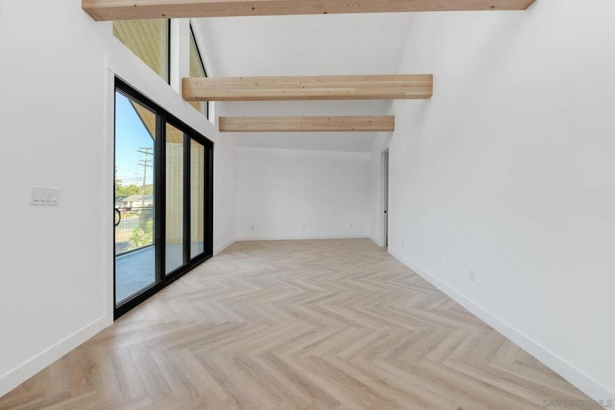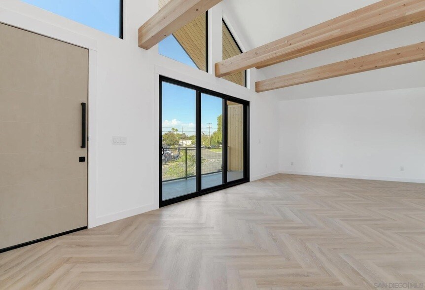 Gorgeous, ultra modern and chic, brand new construction, detached home in La Mesa. Overbuilt solar system on the roof should cover entire electric bill. 2,580 sqft of total living space including an oversized two-car garage (big enough for a lifted truck), covered downstairs patio area, finished attic w/ 10' ceiling & front deck. Main living space offers 20' cathedral ceilings w/ exposed beam construction, herringbone pattern LVP flooring throughout. High end Bosch appliances w/ custom-built range hood & natural wood cabinetry. La Cantina three panel sliding door, t&g pine accents in the eaves that extend to the ground. 50A electric car charger. You don't want to miss this one!