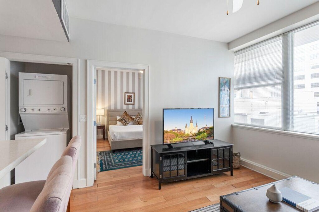 Feel at home in this exceptional residence nestled within a 5-minute stroll from the iconic French Quarter, in the heart of New Orleans. This residence offers a tasteful and fully furnished interior, creating a harmonious blend of modern comfort and the rich cultural tapestry that the city is celebrated for. It features a fully equipped kitchen, handpicked furniture, Wi-Fi, air conditioning, heating, a smart TV, a washer and dryer, walk-in closets, and a dining area. Community amenities include an inviting outdoor pool, a shared grill/BBQ area, shared terrace, outdoor furniture, and a fitness center. On-site paid parking is available, starting at $40 per night (max for 3 cars). A high chair and Pack ’n Play are available upon request. Located just a block from Canal Street, this residence offers seamless access to the famous Streetcar (trolley), making exploration of the city and its attractions a breeze. The nearby convention center is a mere 1.6 miles away. Immerse yourself in the famed nightlife, with Bourbon Street's jazz clubs, Cajun eateries, bars, and bistros just steps away. For those seeking a quieter escape, meander through charming streets leading to the French Market, a haven for gourmet food and local crafts. The residence is also within walking distance of the Caesars Superdome stadium. House parties and the use of illegal substances are strictly prohibited and any violation will result in immediate eviction and a $500 fine. A copy of a State Identification Card or Driver's License will be requested upon booking. Guests residing within a 40-mile radius must contact the host before booking. Travelers must be at least 21 years of age to make a reservation. Smoking is not permitted anywhere in the building and any violation of this policy will incur a $250 fine, plus cleaning costs to remove smoke odors from the unit and linens. Pets are not allowed and violating the pet policy may result in a $500 fine. Guests with service animals are encouraged to contact us before booking. Quiet hours are from 9 p.m. to 8 a.m. and violators will be charged a $200 fine. The number of guests on the reservation cannot exceed the number specified in the booking, including visitors. Failure to comply with the guest limit may result in cancellation of the reservation. For same-day late check-ins, prior approval is required. Video surveillance may be used in public areas. [SI]