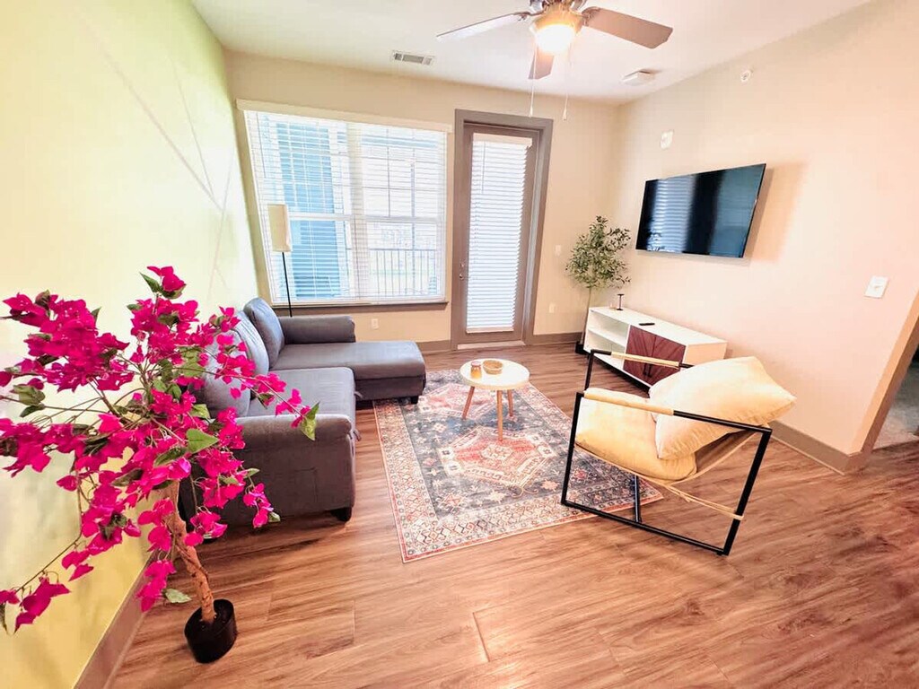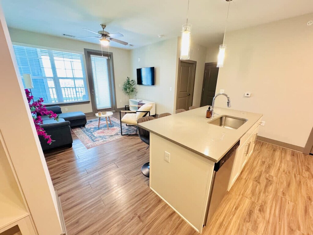 Feel at home in this modern 1-bedroom, 1-bathroom apartment in Winter Garden, FL. Located on the third floor with only two ramps of stairs to reach the unit, this stylish and cozy apartment is the perfect home base for your Florida getaway, offering a relaxing atmosphere and convenient access to nearby theme parks, shopping, and dining. The apartment features a bright and spacious living area with ceiling fans in both the living room and bedroom, an open layout with upgraded flooring and modern tile accents, and a private balcony. The fully equipped kitchen includes energy-efficient stainless steel appliances, granite countertops, a wine fridge, refrigerator, stove, microwave, coffee maker, blender, toaster, cookware, and utensils. The spacious bedroom offers a comfortable king-size bed with premium linens and a large walk-in closet. Pets are allowed, but some breed restrictions apply: Pit Bull Terriers/Staffordshire Terriers, Rottweilers, Doberman Pinschers, Chows, Presa Canarios, Akitas, Alaskan Malamutes, and Wolf-Hybrids. Enjoy resort-style amenities and easy access to shopping, dining, and major Central Florida attractions like Disney. Quiet hours are between 10:00 PM and 8:00 AM. Luggage drop-off is available after 12:30 PM with advance notification. [SI]