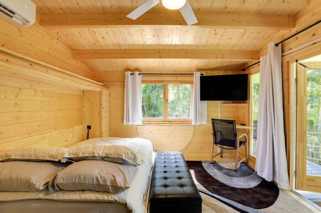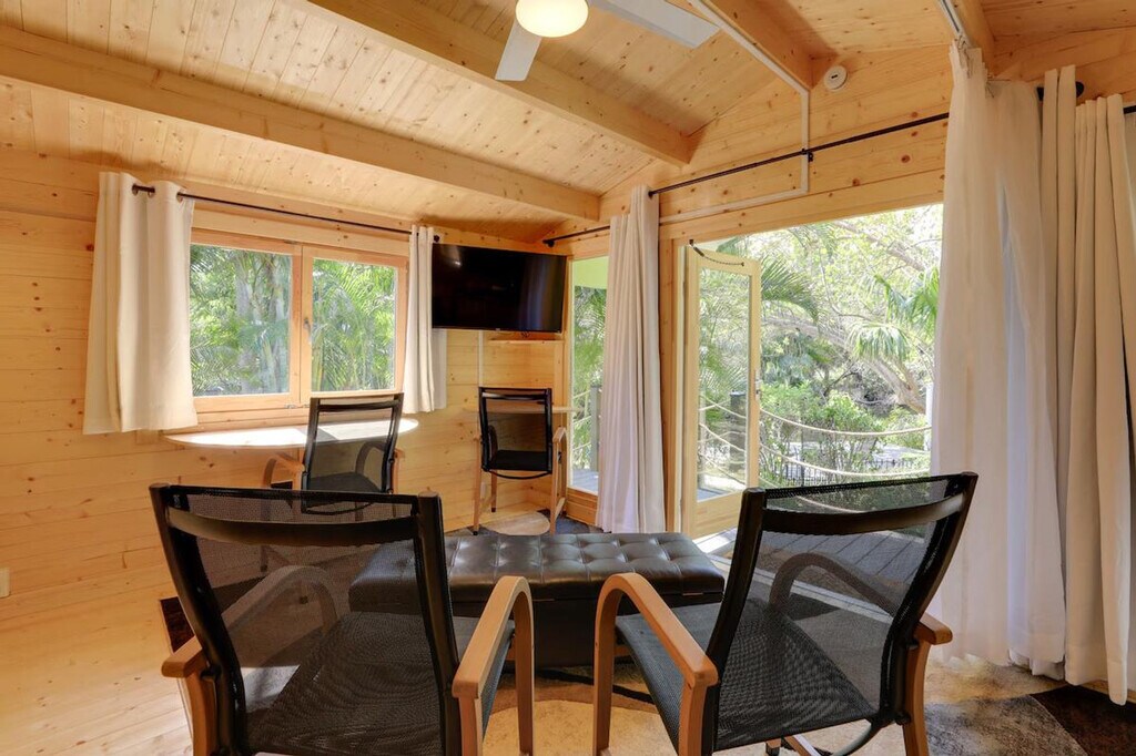 Feel at home in this Bradenton studio vacation rental, offering a quiet waterfront setting and convenient access to downtown. This single-story studio apartment offers step-free access. This studio features a private deck with a water view, a Smart TV with cable, and a walk-in shower. The kitchenette includes a mini fridge, hot plate, microwave, Keurig coffee maker with starter coffee, toaster, dishware and flatware, and cooking basics. Guests also have access to a shared dock for small boats and watercraft, kayaks and life vests, a fire pit with firewood, and a spacious yard with a hammock. Access to a full-sized refrigerator and freezer is available upon request. Central heating and A/C, towels and linens, trash bags and paper towels are provided. Located less than a mile from downtown Bradenton, this apartment is conveniently located near the Bradenton Riverwalk and 10 miles from Coquina Beach. The homeowner and a long-term tenant live on-site in completely separate units on the property and may be present during your stay. Quiet hours are observed from 10:00 PM to 7:00 AM. Pets are not allowed. Events, parties, or large gatherings are not permitted. Includes a work desk and free Wi-Fi. [SI]