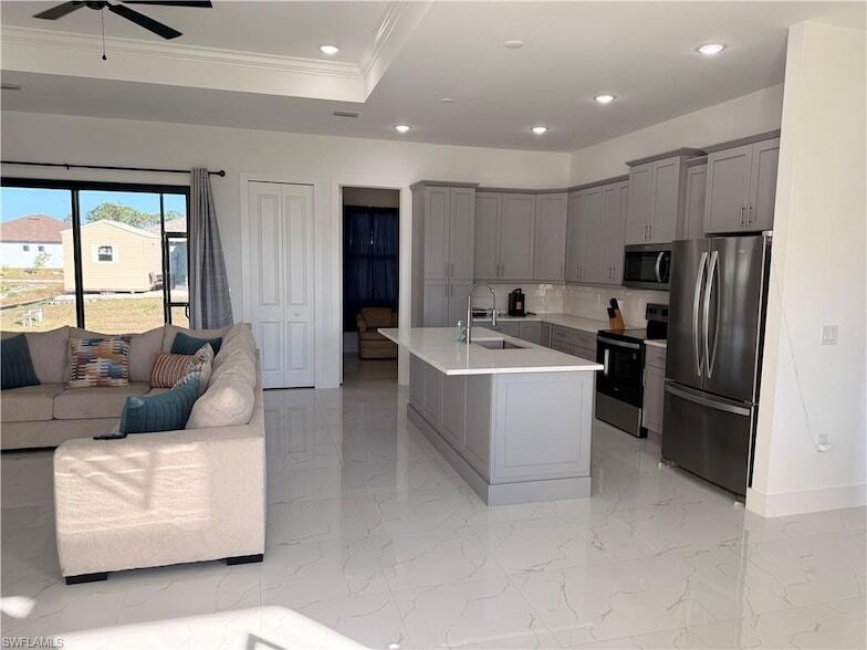 Discover the epitome of luxury living in this stunning new single-family home, offering 3 bedrooms, 2 beautifully appointed bathrooms, and a versatile den that can easily serve as a home office or potential fourth bedroom. Step inside and be captivated by 24-inch porcelain tile flooring throughout, creating a seamless, modern aesthetic, complemented by elegant mahogany furnishings in all bedrooms. The open and spacious interior flows effortlessly to an inviting lanai, ideal for outdoor relaxation or entertaining guests. Designed with both style and functionality in mind, this home features a paved driveway that enhances curb appeal and an oversized two-car garage for added convenience. The kitchen and bathrooms are thoughtfully finished with timeless Corian countertops, a beautiful backsplash, and upgraded faucets, adding a refined touch to every space. Additional highlights include an in-residence laundry area with wash tub, ensuring everyday convenience, comfort, and efficiency. This exceptional home goes beyond the ordinary, showcasing quality craftsmanship and refined finishes throughout. Elevate your lifestyle with a residence that perfectly blends elegance, comfort, and modern living. Welcome home your dream home awaits.