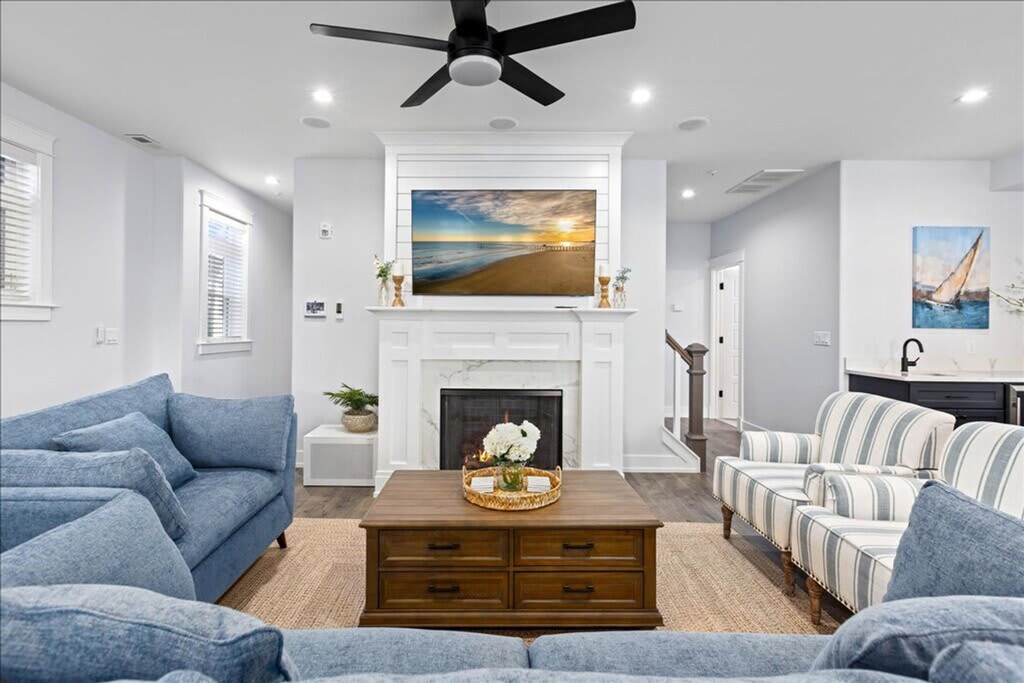 The advertised rate of $19,560/month is the lowest available price, based on a 1 month(s) stay with a move-in date of September 27, 2026. Rates vary depending on the duration of stay, season, and other parameters. For exact pricing and additional pricing components, please visit our website and enter your desired move-in and move-out dates. The rate is applicable when billed upfront; it can be higher if billed in multiple payments. Experience "Margate Haven," a centrally located townhome featuring a 3-car garage, private foyer, and elevator access. Feel at home in this residence boasting 5 bedrooms and 4.5 baths. This home features an open entertainer's design, cozy fireplace, central kitchen island for culinary creations, and a dining area perfect for shared meals. The fully equipped modern kitchen has stainless steel appliances, all cookware and dishes, toaster, blender, Keurig coffee maker, an island with bar seating, and ample counter space. There are also 2 private balconies facing the excitement of Ventnor Avenue, one off the living area and one off the primary suite. Beach gear includes 12 beach tags conveniently collected on a lanyard, 12 beach chairs, 2 coolers, a wagon/cart and an umbrella (no beach towels). Linens, towels, and essential amenities are included. This home is equipped with central heating and air, and a washer and dryer in-unit. Garage parking is available for up to 3 vehicles (parking in the shared driveway is not permitted) plus ample free and metered street parking in the neighborhood. Nestled in the heart of Margate, 'Margate Haven' offers an unbeatable location, just a short two-block stroll from the sandy shores and Ventnor Avenue, brimming with local boutiques and dining options. Enjoy a leisurely walk to some of the area's best restaurants, or explore the charming shops that line the street. Various entertainment options are within easy reach, offering a vibrant nightlife and daytime activities. Quiet hours are between 10 pm and 8 am. Guests must be respectful of our neighbors, other guests, and the overall community at all times. Any disturbance incident that results in police involvement may result in the immediate termination of a reservation and removal from the rental without refund or warning. There is a zero-tolerance policy. All properties are absolutely no smoking of any kind, including cigarettes, cannabis, vapes/e-cigs, etc. You may smoke outside and well away from any doors or windows, and must clean up any debris (do not throw butts on the ground). Any evidence of smoking will be automatically billed an additional cleaning fee. Guests are fully responsible for any damage, excessive cleaning, or disturbances caused by their pets during their stay. By bringing a pet onto the property, you agree to assume all liability for your pet's behavior and to indemnify and hold harmless the property owner and management from any claims or damages arising from your pet. Guests with pets are 100% responsible for keeping their pet under control at all times. Size/weight and breed restrictions may apply. Reservations booked through certain platforms where credit card payments are processed by the trusted partner will be subject to a separate 3.5% processing fee. The processing fee is strictly non-refundable in the event of a voluntary cancellation. There are security cameras present on this listing in the following locations: exterior front entryway/doorbell camera, exterior rear entrance and deck/patio/driveway area. These cameras may record audio & video footage 24/7. There are absolutely no recording devices of any kind inside the home or apartment or any other private area. [SI]