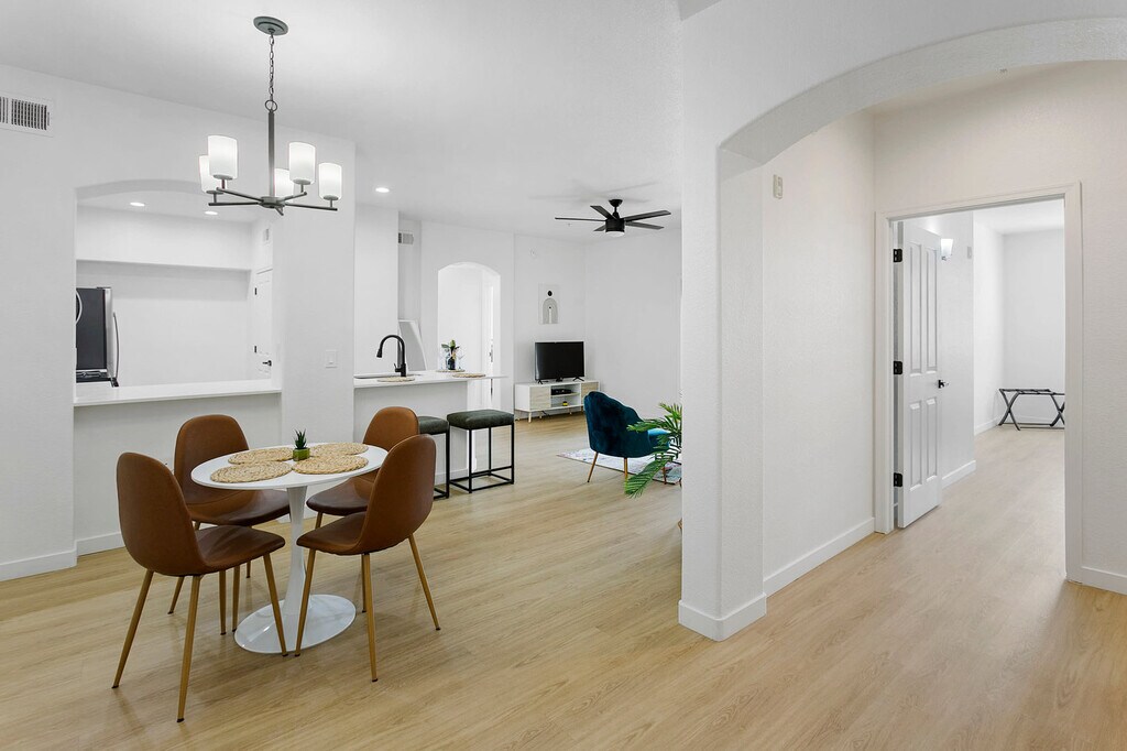 Feel at home in this beautifully built condo in Glendale, just steps away from the stadium. This garden-style unit requires climbing one to two flights of stairs, but ground floor units may be available upon request. This apartment is suitable for a family, group of friends, or business travelers, and it has all the amenities necessary to enjoy your stay. Great amenities await you, including quartz countertops, stainless steel appliances, and a fully equipped kitchen. Enjoy 100mbps+ internet, modern decor, a Smart-TV with streaming apps installed, a washer and dryer, complimentary coffee, and a patio. Enjoy access to the resort-style heated pool, jacuzzi hot tub, fitness center, large outdoor fireplace, BBQ area, and arcade. A pet fee between $100 and $300 will be collected separately, based on stay length, with a maximum of 2 pets allowed (40lbs combined), excluding Pit Bulls and Bull Mastiffs. All pets must be on a leash when outside on the property. Ideally located close to different attractions, this apartment is just a quick drive or Uber/Lyft ride anywhere. It's located right in the Westgate entertainment area, where you can enjoy live music, movies, football, and dining all in one place, just across the street from the building. Smoking of any kind is not permitted within or outside of this apartment, including balconies, patios, or common and/or parking areas. Any sign of smoking is a violation of the stay agreement, which may result in immediate termination and recovery fees beginning at $500. There is a $500 penalty for removing smoke detectors and a $200 penalty for lost key fobs. No outside guests are allowed without permission. Quiet hours are observed from 9pm-8am each day. Guests must agree to not disturb neighbors at all times during the stay. No weapons or drugs are allowed, and police will be called for violating this rule. Check-in is at 4 PM and check-out is at 11 AM, with a $75/hr late fee. [SI]