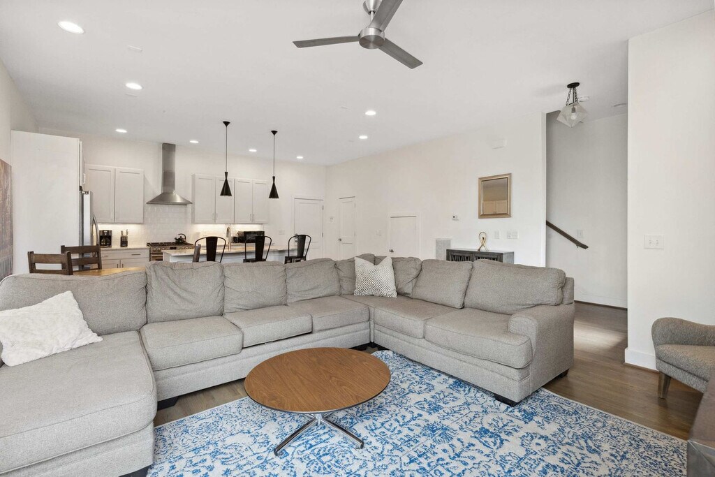Feel at home in this modern Nashville residence, perfect for large groups. Situated less than 2 miles from Lower Broadway, Nissan Stadium, Bridgestone Arena, and the iconic Honky Tonks, this home offers 4 bedrooms, 3.5 baths, a fully stocked kitchen with bar seating, a spacious living and dining area, and a large rooftop patio. Enjoy the convenience of a washer/dryer, smart TVs, Wi-Fi, and parking with a 2-car garage and driveway. Designed with comfort in mind, this home features a fully stocked kitchen with bar seating, a spacious living and dining area, and smart TVs for entertainment. The large rooftop patio provides an excellent space for relaxation and gatherings. Early bag drop is available upon request for an additional $50. Explore nearby attractions with ease, such as Fort Negley just a 3-minute drive away, Frist Art Museum at 4 minutes, Bastion at 5 minutes, The Goat Sobro at 6 minutes, and Adele's Nashville also at 6 minutes. The neighborhood offers easy access to Ubers, Lyfts, and scooters for convenient transportation. Guests must sign a rental agreement and be at least 18 years old to rent. Smoking and parties are not allowed on the premises. [SI]