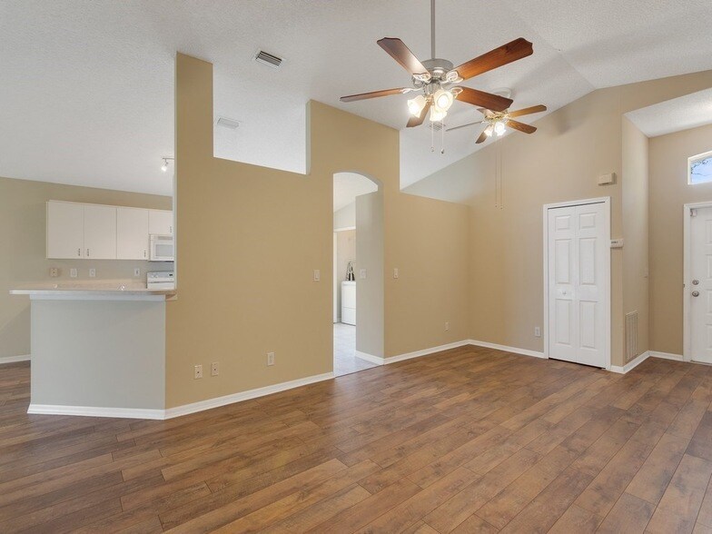 Beautiful and clean home in great location. Minutes to shopping and the beaches. Laminate flooring in living areas and bedrooms, high ceilings in living area and master bedroom, screened lanai overlooking a pond, spacious eat in kitchen with breakfast nook and large pantry. Living area, dining area & family room offer lots of flex space. Master bath with soak-in tub, a separate shower and a walk in closet. Waterford Lakes community offers heated pool and a playground. First, last and security deposit to move in. Available May 1st. Pets up to the owners discretion. Lawn maintenance included.