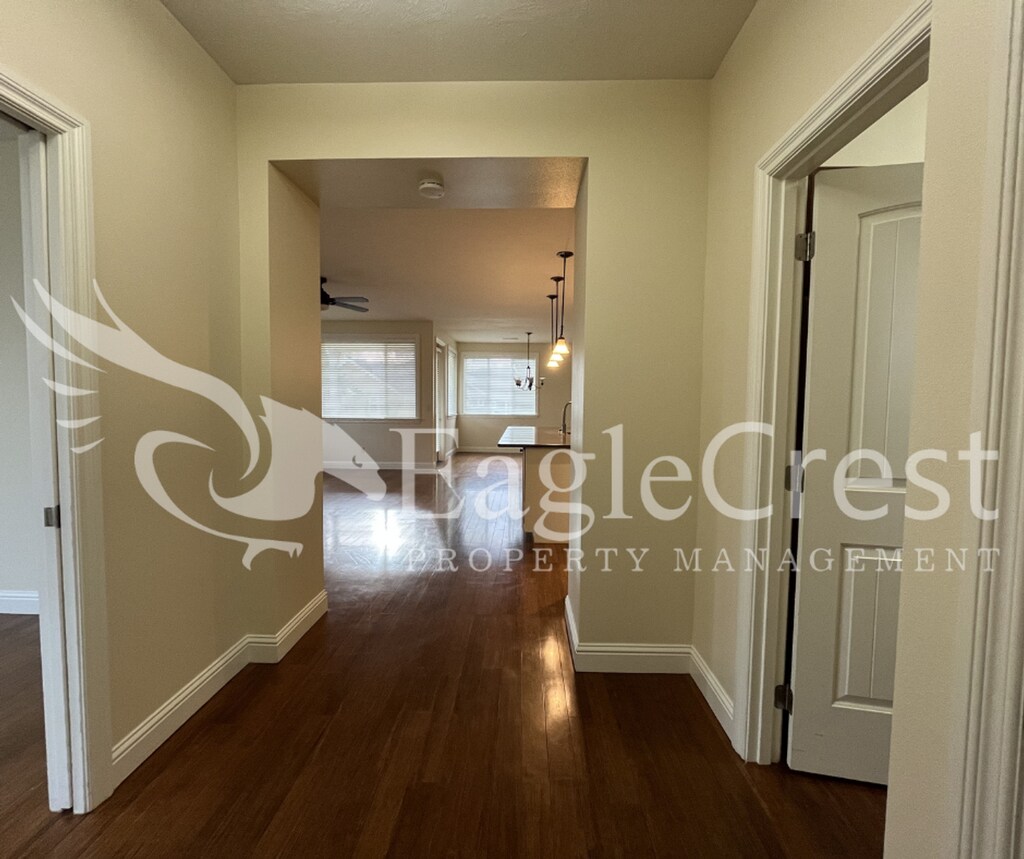 Welcome home to this beautifully designed 3-bedroom, 2-bath home offering 1,636 square feet of comfortable living space in a charming neighborhood near scenic walking paths. Featuring hardwood flooring throughout and a neutral color palette, this home is filled with natural light from large windows that create a warm and inviting atmosphere. The open-concept living and dining area is highlighted by a cozy gas fireplace with an elegant decorative mantle and modern remote-controlled ceiling fan fixtures. The spacious kitchen boasts cream-colored cabinetry, a large island with breakfast bar seating, corner pantry, and stainless steel appliances including an electric stove, microwave, dishwasher, double-door refrigerator, and garbage disposal. The generous primary suite offers a large walk-in closet and a luxurious on-suite bathroom complete with a deep soaking tub and expansive walk-in shower. Additional features include a utility room with washer and dryer hookups and extra storage cabinets, a two-car garage with ample shelving, and a lighted outdoor patio just off the dining area—perfect for relaxing or entertaining. Backyard Landscaping Is Tenant Responsibility Tenant Pays A Flat Rate Fee $200.00 For Water/Sewer Tenant Is Responsible for Electric/Garbage/Gas