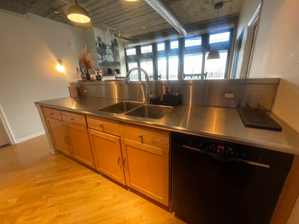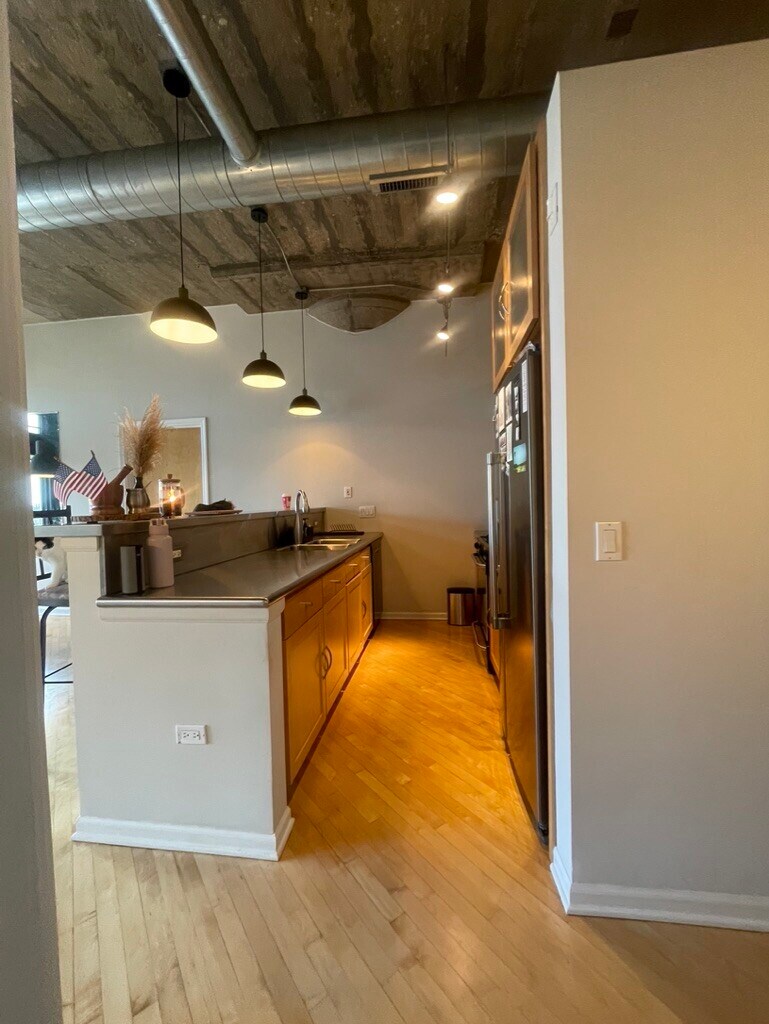 Stylish Loft in University Commons - Heated Parking Spot Included! This sleek, former developer’s model concrete loft boasts 12-foot ceilings, an open floor plan, hardwood floors, and floor-to-ceiling windows that flood the space with natural light. The modern kitchen features stainless steel countertops, a colorful tile backsplash, and a nearly new Maytag refrigerator. Built-in shelving, a cozy fireplace with stainless steel tile accents, and custom entertainment cabinetry add functionality and flair. The spa-inspired bathroom offers a walk-in rainfall shower, elegant tilework, and ambient lighting, creating the perfect retreat. Both bedrooms include custom closet organization, with the primary fitting a king bed and the second a full or queen. Enjoy your private patio (furnished) overlooking the courtyard, pool, dog park, and skyline views, with unique dual access for easy entry to building amenities like the gym, garbage chute, and heated garage. The building also features a rooftop deck with stunning views, a party room, and a vibrant community with social events. Perfectly located near major highways, the CTA Pink Line, and Union Station, this condo combines convenience with the vibrant dining and nightlife of Pilsen, including spots like Dusek’s Board & Beer, Punch House, and S.K.Y. Don’t miss out on this incredible home! Key Points to consider: Ground level: accessible for people with disabilities 2 access doors: most units only have the outside/patio access doors. Concrete walls: excellent noise and heat insulation. Bathroom: fully remodeled in 2021 Bedrooms: both bedrooms include closets with custom drawers. Blinds: custom blinds installed in 2024. Kitchen stools: these are high stools, they're expensive and hard to find and come with unit Heated parking garage! Storage Unit Lease Terms/fees: 12 month lease starting April 1st ending march 31 2027 (long-term lease options negotiable) $2675 sec dep (both sec dep and 1st month rent due at lease signing) $300 pet fee at move-in and $25/mo fee (monthly fee is for a dog only) $600 move-in fee and $250 refundable move-in fee per association Utilities included: Cable/internet, water, trash. Tenant pays heat/gas Tenant may reach out to owner or assigned engineer (Provided by owner) Non-smoking unit