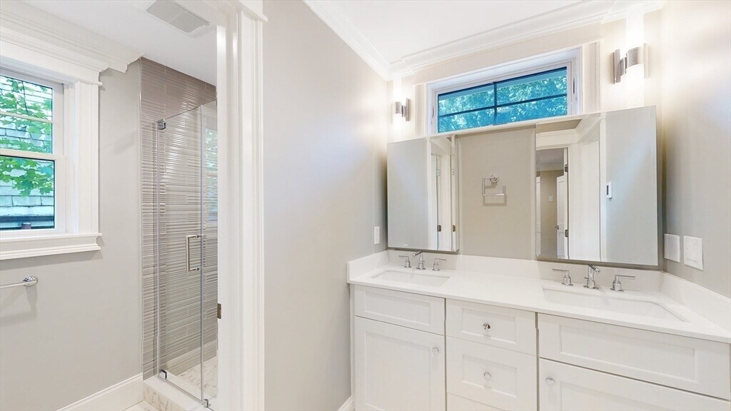 This exquisitely designed townhouse, by architect, Henry Bobek, and built by Pat Corrigan is brand new construction while keeping the charm and appeal of the surrounding neighborhood. You are welcomed by a stunning foyer characterized by red oak flooring and crown moldings throughout. To the right of the foyer, an open-concept space unfolds, combining the kitchen and dining area. Oversized windows grace this space, allowing an abundance of natural light to saturate the surroundings. The kitchen, a haven for culinary enthusiasts, showcases custom-crafted cabinetry that seamlessly marries functionality and style. The aesthetic is completed with luminous white quartz countertops, which complement the top-of-the-line Bertazzoni stainless steel appliances adorning the space. Adjacent to the kitchen and dining space, the living room beckons with its allure.