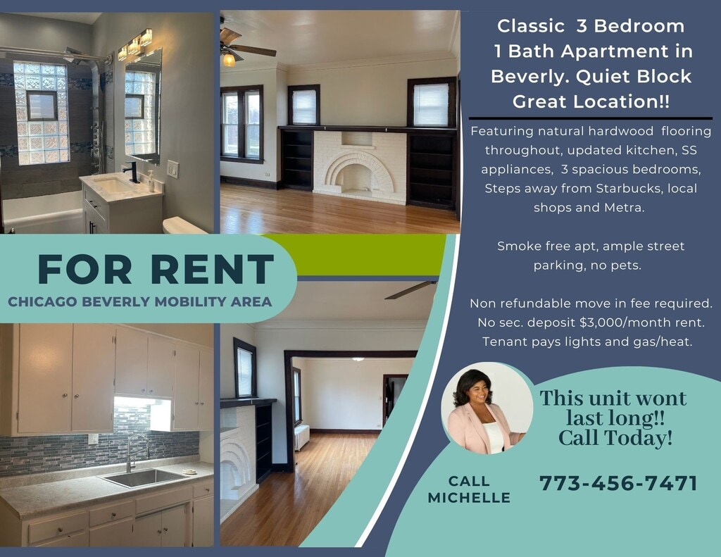 Classic Vintage, amplio apartamento de tres dormitorios, área de Chicago Beverly. - ¡Apartamento Beverly de Chicago en el segundo piso! Mucho espacio para vivir. Techos altos, relucientes pisos de madera en la sala de estar y el comedor, amplia sala de estar con chimenea y manto cosméticos, tres dormitorios de tamaño agradable, cocina amplia con despensa independiente, habitaciones recién pintadas, baño nuevo, ventanas nuevas y persianas. , Ubicación conveniente. A pasos de Metra Station, Starbucks, CTA y las tiendas de 103rd en Beverly. Bloque residencial silencioso. Actualizar cocina (próximamente fotos adicionales) Electrodomésticos de acero inoxidable incluidos. No fumar ni mascotas. Alquilar 2500 USD/mes. Sección 8/Programa de movilidad bienvenido/aceptado. Se requiere un cheque de crédito por un cargo no reembolsable de $50.00). ¡Próximamente fotos! Envíe un correo electrónico a Michelle para obtener un folleto y mostrar información. Sin Depósito, pero cargo por mudanza no reembolsable de $1,250.00.