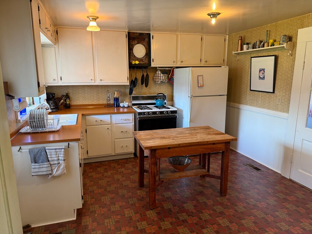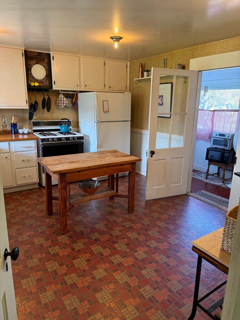 This lovingly maintained historic farmhouse blends rural living blocks to downtown Talent and easy walking distance to the heart of town. It is a furnished property but can be unfurnished. The nicely sized three bedrooms have high ceilings, lots of windows, dressers, and comfortable beds—a double, queen and twin and desk space for work. The living room and dining room boast antique and modern furniture —and smart TV— create a comfortable living space that gives a nod to the house’s history. The high ceilings, ample natural light and architectural detail add charm and character to the living spaces. The classic clawfoot tub/shower insert adds to the historic charm of the property. The classic feeling farmhouse kitchen has an original decorative wood cook stove and modern appliances, with a laundry room off of it. The other side of the charming kitchen leads to the back covered patio where one can watch the sunset and amole bird activity. A large covered front porch and large covered back porch off the kitchen leading to a outdoor patio add extra outdoor living space. The home sits on a large double lot with garden beds and extensive outdoor space. Former tenants have called this home and environment “magical.” It is a very special property for those who love older homes with modern conveniences, large covered decks and huge yards. The home is furnished and includes utilities, but we would consider unfurnishing it. Rent with utilities is $2600/month. Without utilities and unfurnished is $2250/month.