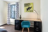 The condo is a two bedroom one bathroom condo. The spacious primary bedroom is located on the left with a King size bed, smart TV, night stands with USB compatible lamps, desk & chair. There is plenty of storage in the chest of drawers as well as in the large walk-in closet. The guest bedroom is located on the right through the living room. This room has a smart TV, queen size bed, night stands with USB compatible lamps, closet, desk & chair. The bathroom has a shower/tub combination and the vanity.