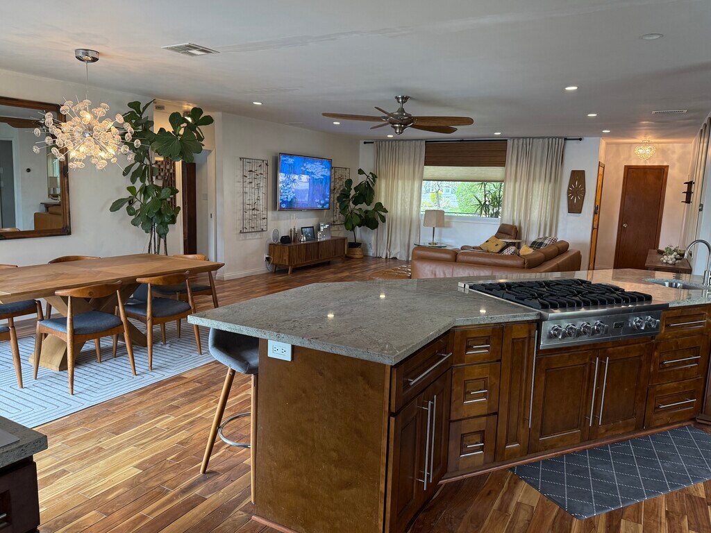 Furnished Midcentury modern pool home in hills of Burbank. Open concept with stainless steel Viking/Thermador/Fisher Paykel appliances. Hardwood floors throughout. Tiled baths. Central Air/Heat. 3 bedrooms 2 baths upstairs and a full basement with washer & dryer downstairs. King bed and 3/4 ensuite bath in primary bedroom. 2nd bedroom with West Elm queen bed and 50" TV, and 3rd bedroom has a daybed that serves as a couch that converts into a king bed, with desk. Basement for storage with washer/dryer. Beautiful mountain views. Award winning schools. Tastefully decorated and includes many kitchenware (blenders, food processors, instant pot/slow cooker, pots/pans, glassware, flatware.) Utilities (up to $500) included along with Hi-Speed internet, weekly gardener & pool services, and bi-weekly maid service included in rental. Renter to provide linens. Minimum 3 month lease. If renter wishes to not utilize any amenity listed, no credits are given.