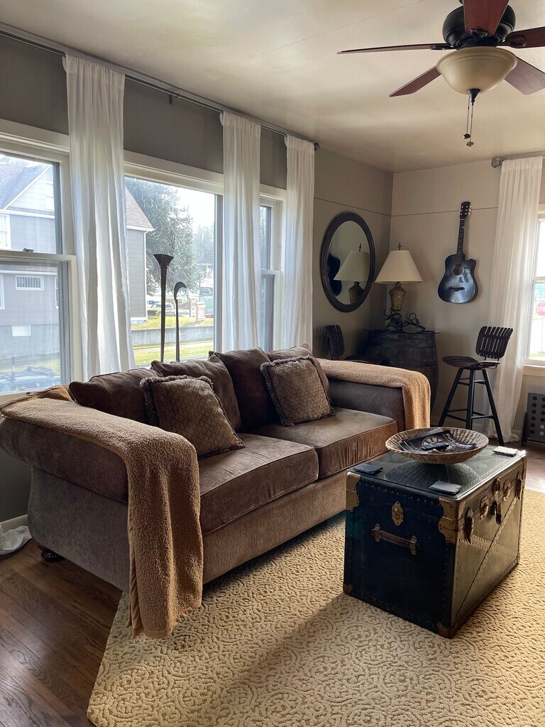 Very nice townhouse in triplex Downtown port angeles All utilities included Wifi included (high speed 256) Furnished Two bed one bath Attic gym Mountain view Two blocks from ferry 1200sf Hardwood floors Ceramic tile kitchen and bath Front and back door Keyless entry on both High ceilings Ceiling fan in living and main bedroom New high end stainless Unique architectural details Office area Walk in closets Storage Laundry (high end samsung) Off street parking Very nice yard with Bbq firepit, seating, yard care included $3000 mo deposit $1200