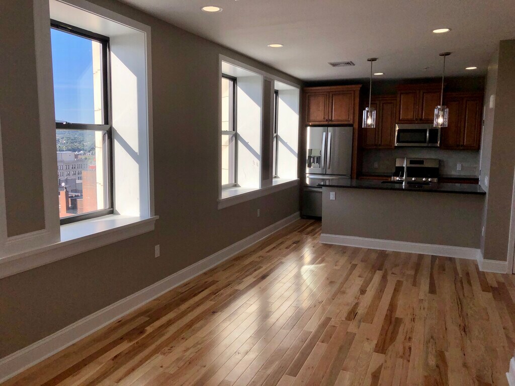 12 Month Lease Live in the tallest apartment building in downtown Scranton. This beautiful 1 bedroom 1 bathroom downtown apartment has: unparalleled views of the city, open living/dining, solid wood floors, granite countertops, beautiful wood cabinetry, full sized washer/dryer, sleek stainless-steel appliances, secured entry system (NO keys to lose), spa-like bathroom with body jets, rain shower and soaking tub. Access to fitness center. Access to roof top deck. Tenant pays for electric, cable/internet (Xfinity), and parking ($95 per month per vehicle) additional parking if needed. Owner pays for water, sewer, gas, and trash. Pets are permitted with fee ($250 non-refundable fee and $25 per month) Call or text Michael for a tour 570- 877-41 49 Owner is a licensed real estate broker/agent Prices and availability subject to change without notice Square footage definitions vary. Displayed square footage is approximate. Earnings to exceed 65000 annually. Clean background and no past evictions.