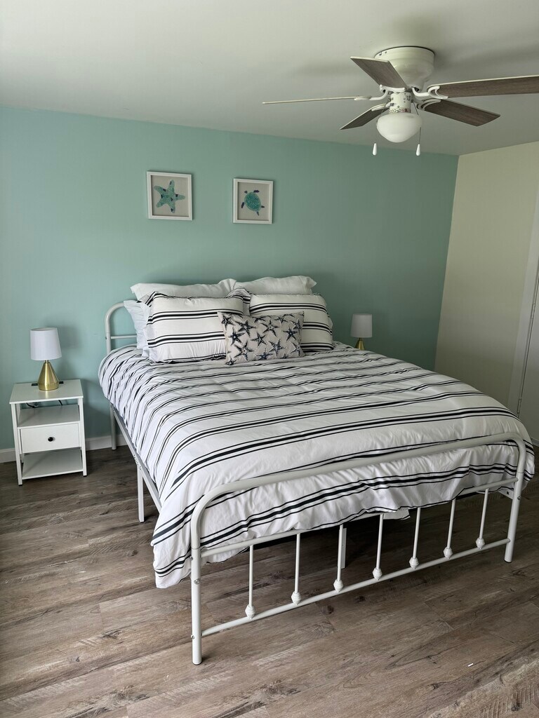 **FULLY FURNISHED WINTER RENTAL** Looking for someone for October 1. Monthly lease considered. Pets considered. We will pay quarterly for: 1. city trash removal bill (you buy town trash bags as needed) 2. water bill. You pay cable and electric. Can negotiate monthly cleaning as well. Consider Ocean’s 11 your home away from home for your short or long term stay! With 1 full bed in the bedroom and a cozy living room with a queen sofa bed, our phenomenal property is perfect for couples or individuals. You'll find all the essentials you need to make your stay comfortable, including beach chairs and towels. The private beach is conveniently located across the street. Whether you're planning a long or short stay, our place is designed to make your stay one to remember. Living room: Queen pull out couch Electric fireplace TV Kitchen: Refridgerator Stove Microwave Table for 6 Toaster Keurig coffee machine Insta pot Fully stocked with eating/cooking utensils Cooking sheets and mixing bowls Pots/pans Spices Knife board Cutting board Strainer Dinnerware Bathroom: Tub/shower combo Towels and wash cloths Beach towels Blow dryer Bedroom: Queen size bed Bureau TV Access to washer and dryer Outside: Deck with outdoor dining Propane grill