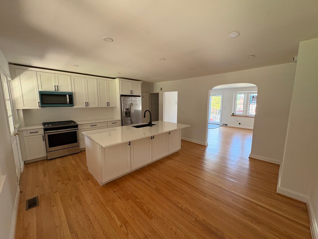 A beautifully remodeled town home in Rodger Forge, 3 bedroom 1.5 baths a half black from Rodgers Forge elementary school. Gourmet kitchen with stainless steel appliances. Hardwood floors throughout. finished basement with full size washer and dryer. Fenced in back Yard. Now available $2,500. One months security deposit required. No Pets. Great walkability to shopping and restaurants. must see it to believe it!