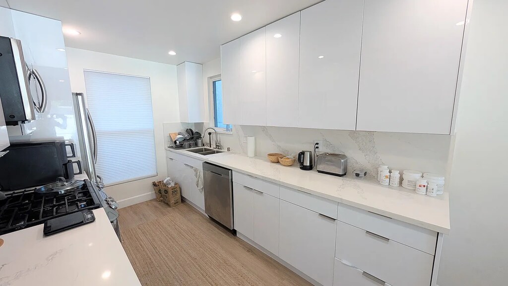 Exceptional light-filled garden apartment in the best Santa Monica location. Unit has been fully updated with great attention to detail. Huge kitchen with ample counter space features European-style cabinets with quartz countertops and stainless steel appliances. Dining area looks out through large windows into gated gardens and outdoor space. Highlights include in-unit Washer/Dryer, AC, rainfall shower, recessed lighting, and luxury vinyl plank throughout. Bike to the beach, walk to Montana Avenue or take a brief drive to Brentwood. Short stroll to Douglas Park tennis courts, lawn bowling, and duck pond. Unit includes a private garage with wifi opener (compatible with Amazon in-garage delivery). Total of three units on property. Water and trash included. Don't miss this chance to enjoy the very best of Santa Monica living!