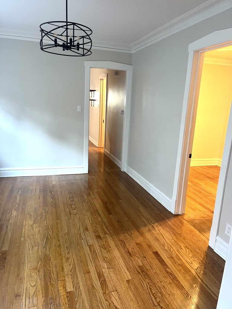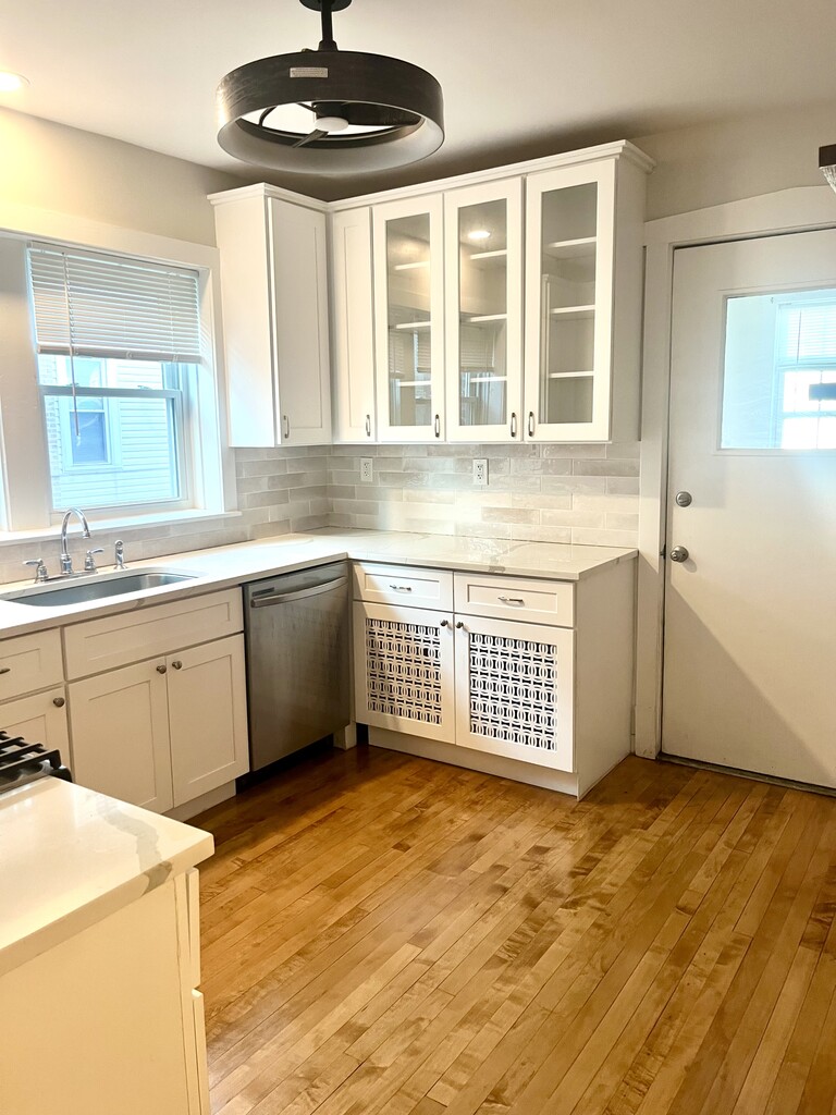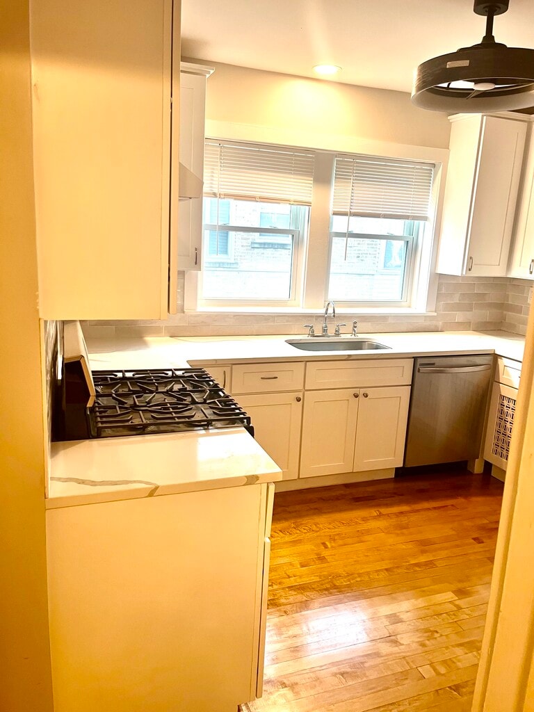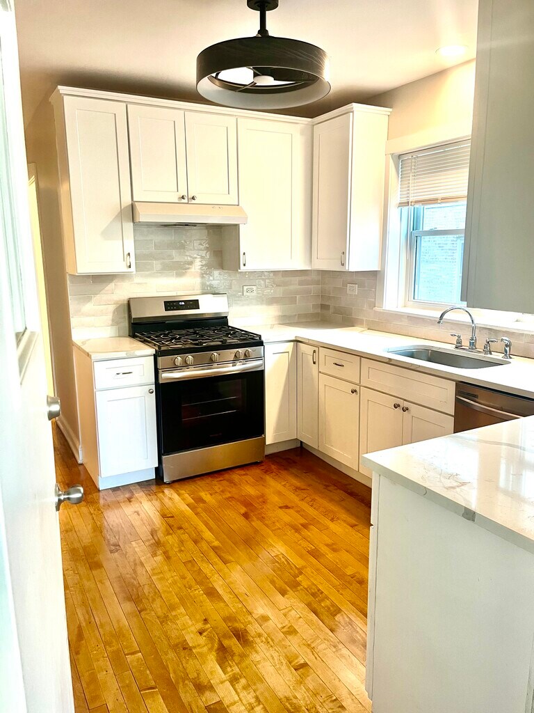 Newly renovated two bedroom, one bath apartment in a three unit building. New kitchen appliances, cabinets, fixtures, etc. Granite countertops. Beautiful living room with ten windows, lots of light. Separate dining room. Hardwood Floors throughout. New bathroom. Parking space available. Close to public transportation, walk two blocks to blue line. Restaurants, ice cream, groceries, etc., two block walk. Heat included. One parking spot included.