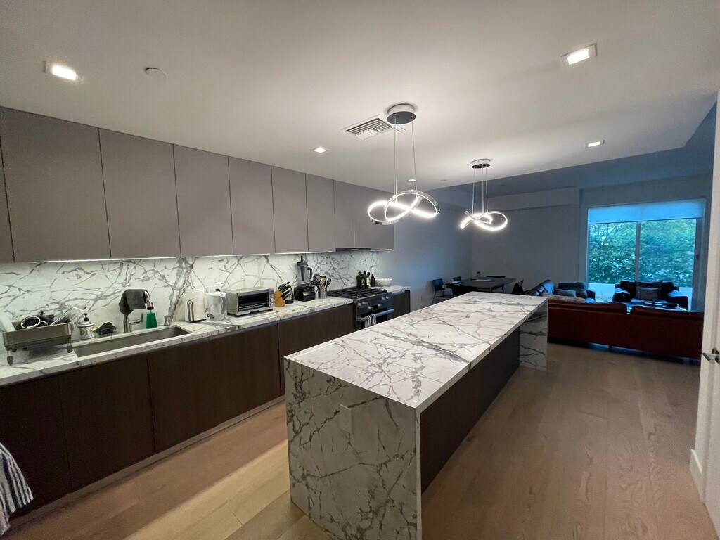 Your newer two-story WEHO town home beautifully designed is waiting for you to start the new year in style. This modern residence has two large 3bedrooms both with in-suite baths, open floor plan, gourmet kitchen and lots of natural light. This residence is architecturally interesting with its geometric shape and clean lines. It gives that welcoming and visually stimulating feeling throughout. This unit is located on a corner. The unit incorporates high quality finishes, with a European design that does not go unnoticed. There are custom hardwood floors throughout, the kitchen incorporates Italian inspired cabinetry with Italian leather marble/ striated, marble counter tops, island, and Miele appliance suite. The bathrooms include a beautiful marriage of Italian porcelain walls, marble mosaic floors and Caesar Stone. Laundry in unit, underground garage with 2 parking spots. Only minutes from the renowned Santa Monica Blvd filled with shops, restaurants, and culture. Pet lovers welcome.