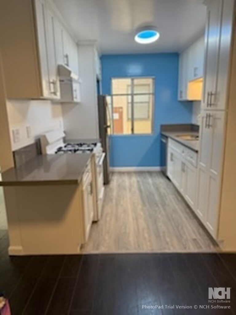 Apartamento n.º 2 es de una habitación y un baño, todos completamente renovados con pisos nuevos, cocina, electrodomésticos, electricidad de plomería, puertas de armarios con espejos. Una fuera de la vía pública para pelar en el estacionamiento techado. Vestidor en la sala de estar y el armario de pared a pared en la habitación, además de un armario para ropa blanca. Cielo azul de pared de la sala de comedor. La cocina cuenta con gabinetes de color gris claro en el techo y alacena, cocina nueva, campana extractora, bajo el encabezado de iluminación, nuevo lavamanos doble. Baño estilo antiguo que durazno de hidromasaje y ducha independiente, con piso de azulejos pulido, y nuevo light,fan.Come ver. En un edificio de estilo art déco de siete apartamento de una cuadra de cada uno de Fairfax y a una cuadra al norte de Pico. Llama o envía un correo electrónico.