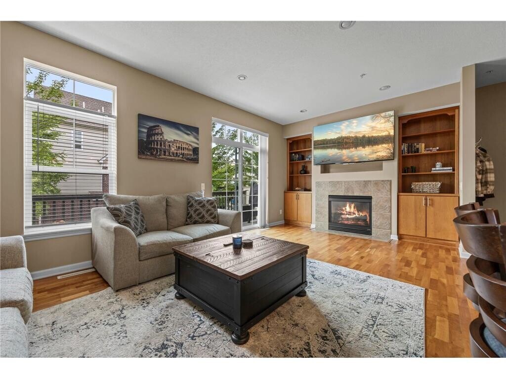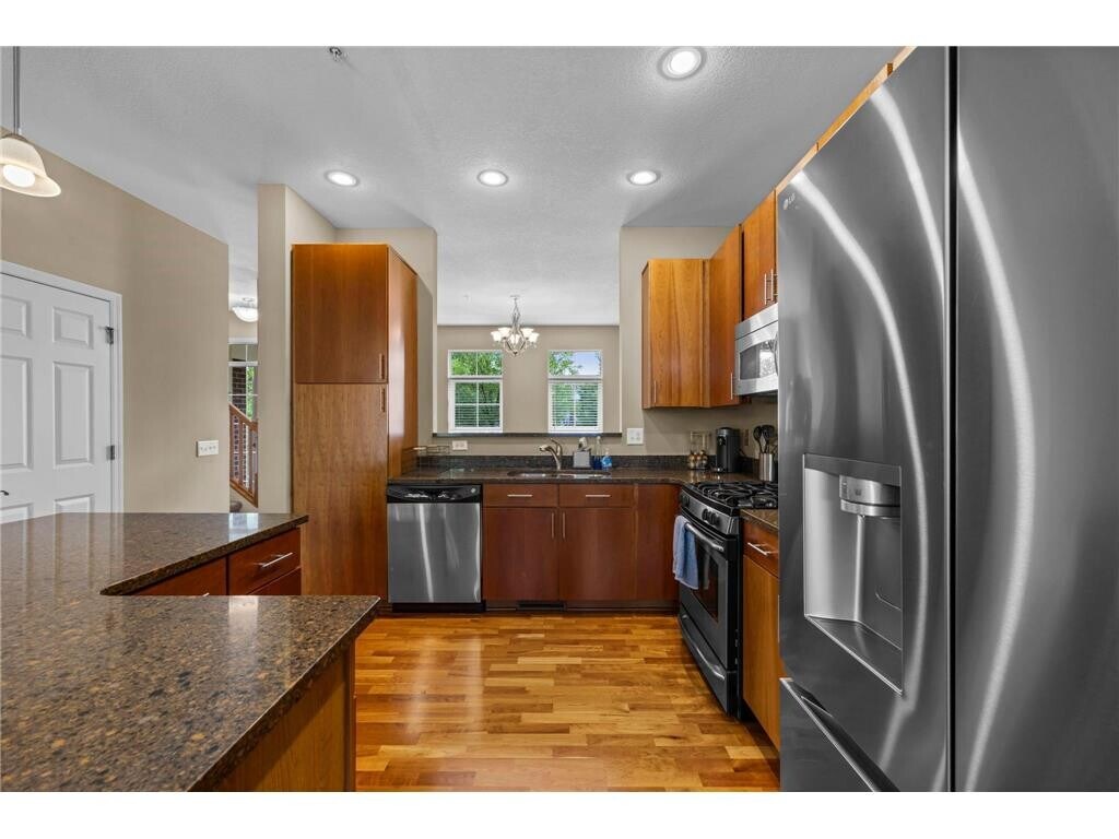 This stunning 2-bedroom, 3-bathroom townhome features numerous updates and desirable features, offering a low-maintenance lifestyle with exterior maintenance, lawn care, and snow removal included. Located in the sought-after Bridges at Arbor Lakes community in Maple Grove, you'll enjoy close proximity to shopping, dining, major highways, parks, and scenic walking trails. The kitchen is a dream, featuring rich wood cabinetry, gleaming hardwood floors, stainless steel appliances, and granite countertops—including a spacious center island with breakfast bar seating, highlighted by elegant pendant and recessed lighting. Just off the kitchen, the generous dining room boasts 9-foot ceilings, a classic chandelier, hardwood flooring, and large front-facing windows that fill the space with natural light. The main-level living room offers a warm and inviting atmosphere with a cozy gas fireplace framed by a stylish tile surround and built-in shelving—ideal for storage or showcasing decor. Beautiful hardwood flooring extends throughout the space, which opens to a spacious 21x6 maintenance-free deck—perfect for entertaining or simply relaxing and soaking up the sun. Upstairs, you'll find a spacious and versatile loft—perfect for a home office, cozy sitting area, or additional living space. This carpeted area features a large rear-facing window that fills the space with natural light, along with a convenient laundry closet equipped with front-loading LG washer and dryer. The upper-level primary bedroom features soft carpeting, a spacious 7x4 walk-in closet, and an additional linen closet for ample storage. Enjoy the comfort of a private ¾ en-suite bathroom complete with a walk-in shower, single vanity with granite countertops, and tile flooring. The second upper-level bedroom offers cozy carpeting and generous closet space, and is conveniently located just steps from a full bathroom featuring a tub and shower combo, tile flooring, and a single vanity with granite countertops. The lower level offers a spacious bonus room—ideal for a home gym, office, or additional living space—featuring tile flooring, a closet for extra storage, and direct access to the attached two-car garage. Additional notable updates include a new water heater (December 2025), garage door opener system (September 2023), New A/C (September 2023), new refrigerator (May 2024), new washer and dryer (May 2024), updated walk-in shower in the primary bathroom (April 2023), and fresh paint in all bathrooms (April 2023). Don’t miss the opportunity to own this beautifully updated townhome in a prime location!