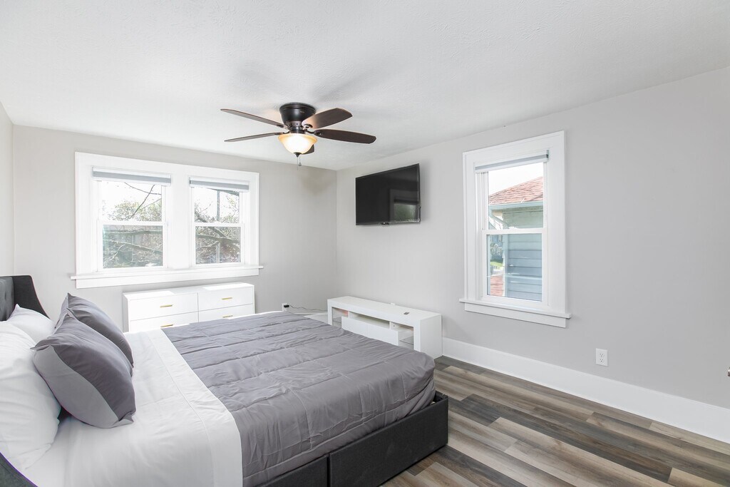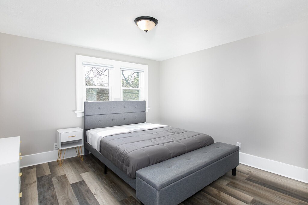 Welcome to this furnished home with utilities included!!! Step onto the front porch and into an inviting open-concept floor plan. The living room seamlessly flows into the dining area, sliding door leading to a backyard deck, perfect for outdoor entertaining. The kitchen boasts brand-new stainless steel appliances, and a convenient half bath is located just off the kitchen. Notice the stylish barn door adding character to the space. Upstairs, are three separate units including a full bathroom and two spacious bedrooms with code locks. There is also a luxurious master suite featuring its own private bathroom with impressive features, including a Bluetooth connection. Throughout the home, enjoy new flooring and a newly added laundry room. With a two-car detached garage and plenty of space for you and your family, this home is ready to welcome you. Don't miss out on this opportunity to make this house your home! Schedule a viewing today.