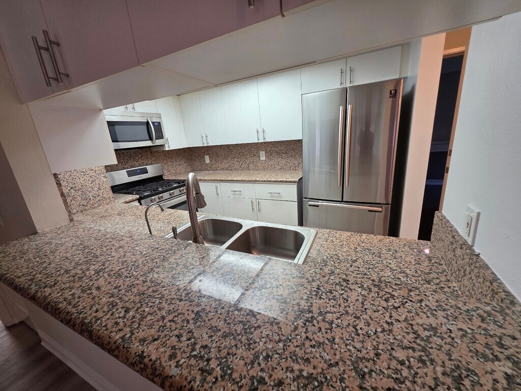 Amazing "Brentwood-adjacent" location! Very spacious, remodeled end-unit with great floorplan. New wood-style floors throughout, new paint, new stainless steel appliances (New refrigerator, New Dishwasher, New Microwave and New stove/oven), new fixtures and more. End unit location provides extra windows to make this unit bright and airy with the privacy of only one small common wall. Fireplace, large balcony and private washer/dryer inside. New stainless steel kitchen sink with water filtration system. Central air conditioning and central heat. 2-car gated/private parking. Elevator from parking level or stairs directly to the apartment from the assigned parking. Small condo building with only 8 units. Very close to many restaurants, markets, shops and transportation. (No driving needed!)