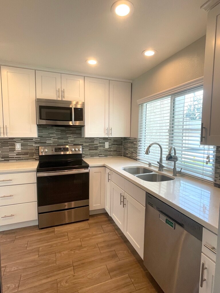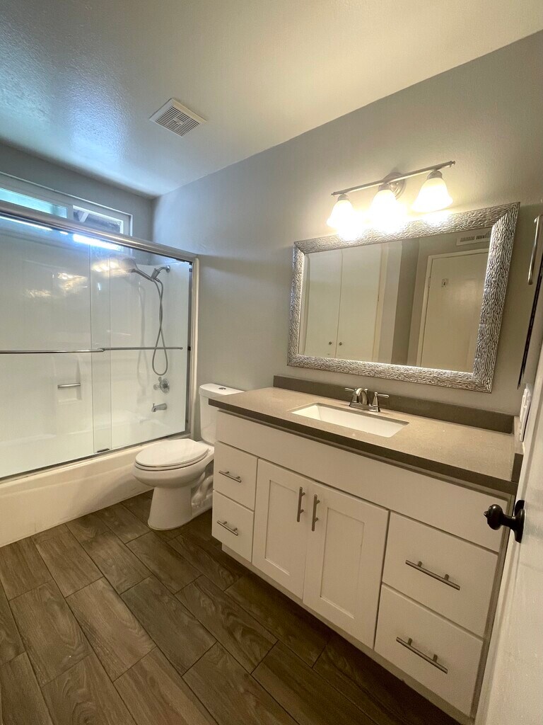 Welcome Home!! Enjoy living in a completely upgraded and well maintained 2 bedroom 1.5 bathroom that is move-in ready. This adorable home features a remodeled kitchen with stainless steel appliances, backsplash, quartz counters, dual pane windows throughout, recess lights, beautiful new tiled floors that look like wood. Ceiling fans, recessed lighting, sparking pool, dont miss out on this one!!