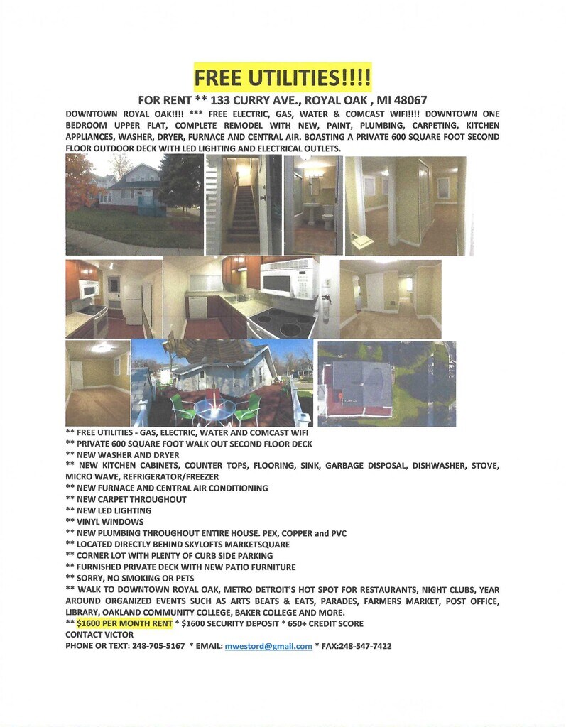 UTILITIES!!! GRATUITO! PARA ALQUILER**SOLO 133 CURRY AVE., ROYAL OAK, MI, 48067 EL CENTRO DE ROYAL OAK!!!! *** SIN CARGO DE ELECTRICIDAD, GAS, AGUA & ¡WI-FI! EL CENTRO DE LA CIUDAD DE UPPER APARTAMENTO, RENOVACIÓN COMPLETA CON NUEVAS, PINTURA, PLOMERÍA, ALFOMBRAS, ELECTRODOMÉSTICOS DE COCINA, LAVADORA, SECADORA, Y AIRE ACONDICIONADO. CUENTA CON UN ÁREA PRIVADA DE 600 ft² DE TERRAZA AL AIRE LIBRE EN EL SEGUNDO PISO CON ILUMINACIÓN LED Y TOMACORRIENTES ELÉCTRICOS. ** SERVICIOS PÚBLICOS SIN CARGO: GAS, ELECTRICIDAD, AGUA Y WI-FI ** PRIVADOS DE 600 ft² DE SALIR SEGUNDO PISO CON TERRAZA ** LAVADORA Y SECADORA NUEVAS ** GABINETES DE COCINA NUEVOS, ENCIMERAS, PISOS, CON FREGADERO, TRITURADOR DE BASURA, LAVAPLATOS, ESTUFA, MICRO WAVE, REFRIGERADOR/CONGELADOR ** NUEVA CALDERA Y AIRE ACONDICIONADO CENTRAL ** ALFOMBRA NUEVA EN TODOS LADOS ** NUEVA ILUMINACIÓN LED ** VENTANAS DE VINILO ** NUEVAS INSTALACIONES DE PLOMERÍA EN TODA LA CASA. PEX, COPPER y de PVC ** UBICADO DIRECTAMENTE DETRÁS SKYLOFTS MARKETSQUARE ** LOTE EN ESQUINA CON MUCHO ESPACIO DE ESTACIONAMIENTO AL BORDILLO ** APARTAMENTOS AMUEBLADOS TERRAZA PRIVADA CON NUEVOS MUEBLES DE JARDÍN ** CAMINA HASTA EL CENTRO DE ROYAL OAK, DE METRO DETROIT LUGAR DE MODA PARA RESTAURANTES, CLUBES NOCTURNOS, EVENTOS ORGANIZADOS DURANTE TODO EL AÑO, COMO LAS GALERÍAS DE ARTE BEATS & LUGARES DE COMIDA, DESFILES, MERCADO DE PRODUCTORES, OFICINA DE CORREOS, BIBLIOTECA, OAKLAND COMMUNITY COLLEGE Y MUCHO MÁS. ** ADJUNTO IMÁGENES DE 3 PÁGINA SOLICITUD PUEDES SER IMPRESORA Y VOLVIERON A TRAVÉS DE MENSAJE DE TEXTO O CORREO ELECTRÓNICO. PONTE EN CONTACTO CON VICTOR TELÉFONO O ENVÍA UN MENSAJE DE TEXTO: 248*705*5167