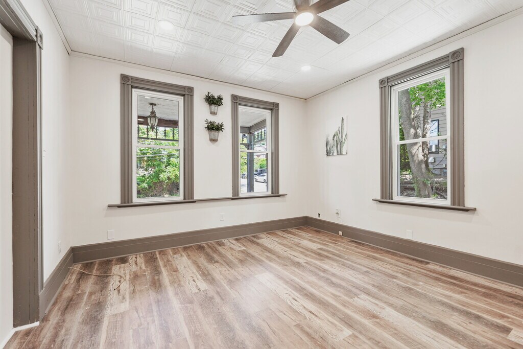 Welcome home to this beautifully renovated two bedroom, one bathroom rental offering a generous 1,500 square feet of living space. Tall ten foot ceilings give the home an airy, open feel you notice the second you walk in. The updated kitchen features stainless steel appliances and plenty of room to cook, host, or pretend you cook. Washer and dryer sit right in the unit, so no hauling laundry like a medieval chore. Central AC and forced air heat keep the space comfortable through every season. Ceiling fans add comfort and style throughout. The layout feels spacious and functional, with room to spread out without wasted space. Pet friendly, because pets live here too. Off street parking included, so no nightly parking scavenger hunts. Located in a quiet neighborhood just 15 minutes from downtown, close enough for convenience, far enough for peace. Fresh finishes. Modern upgrades. A home that feels polished without feeling stiff. Move in ready and easy to love.