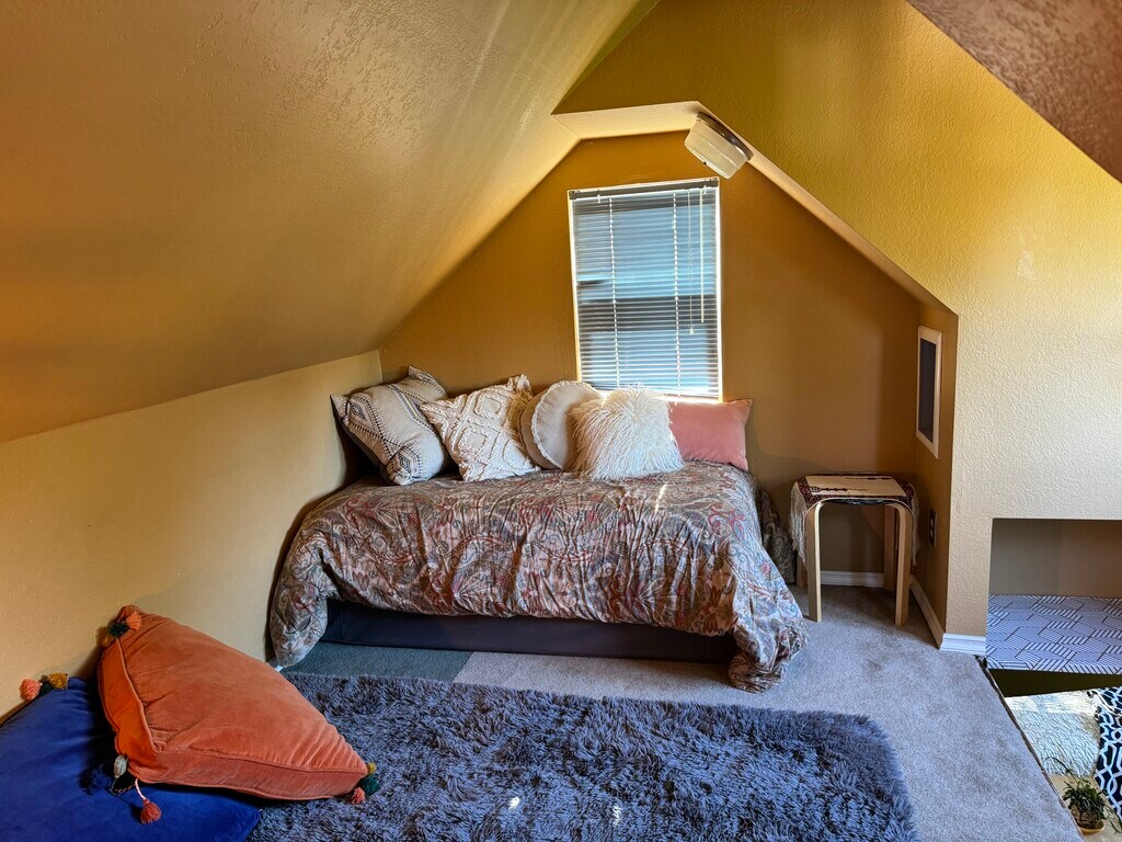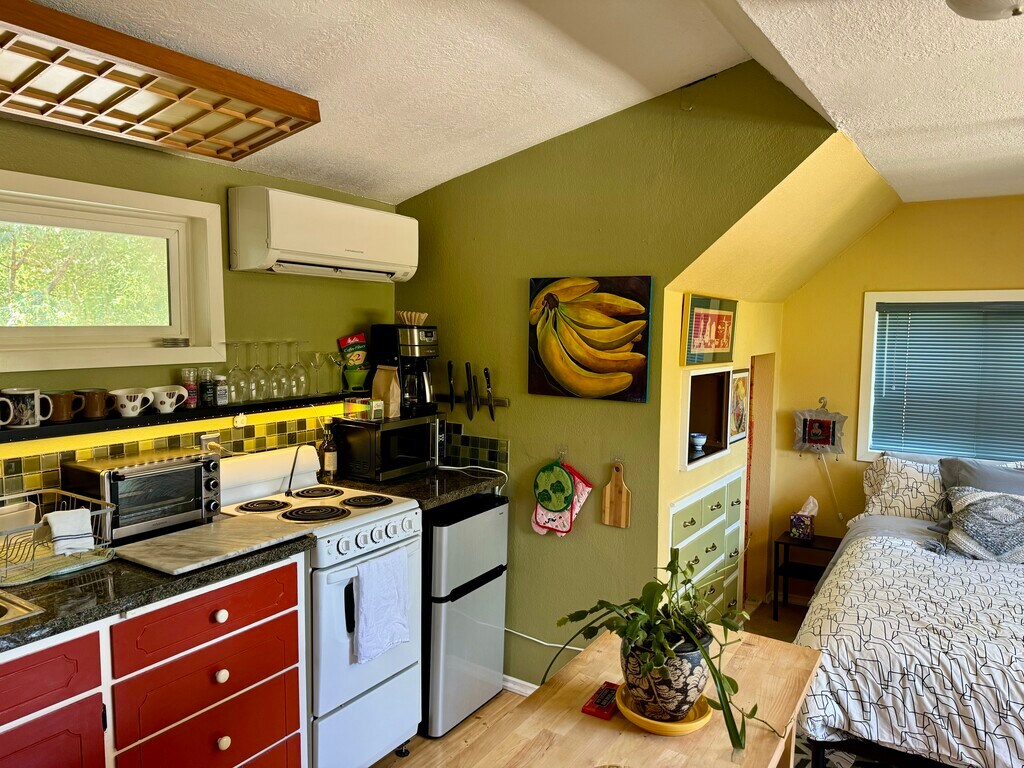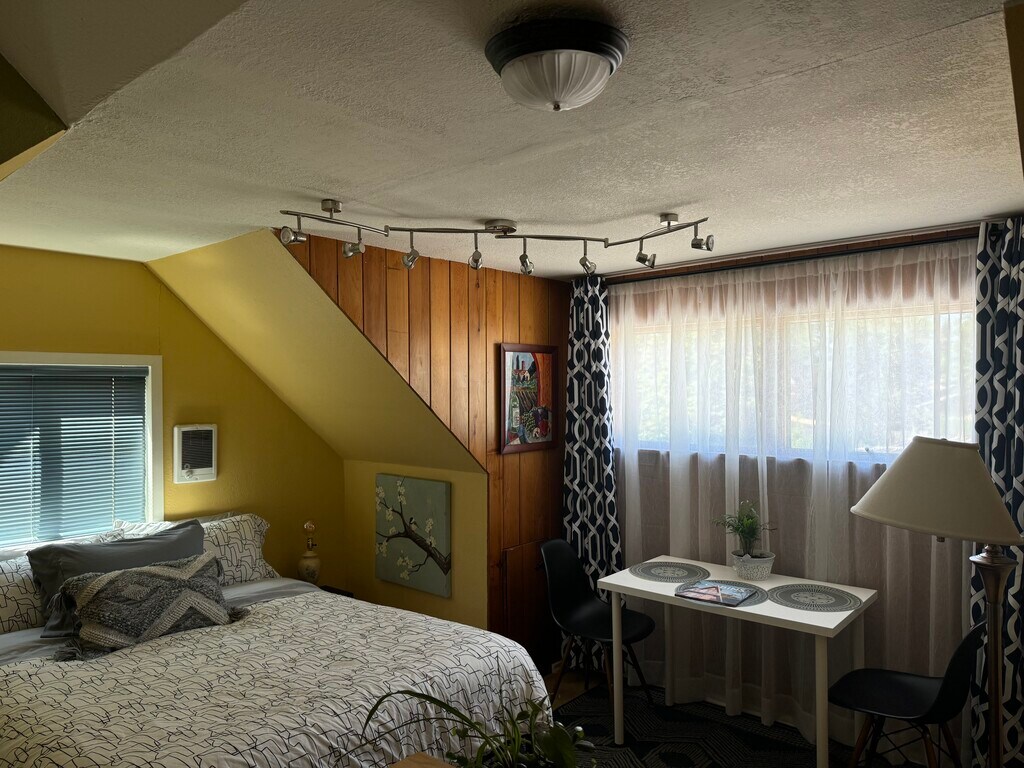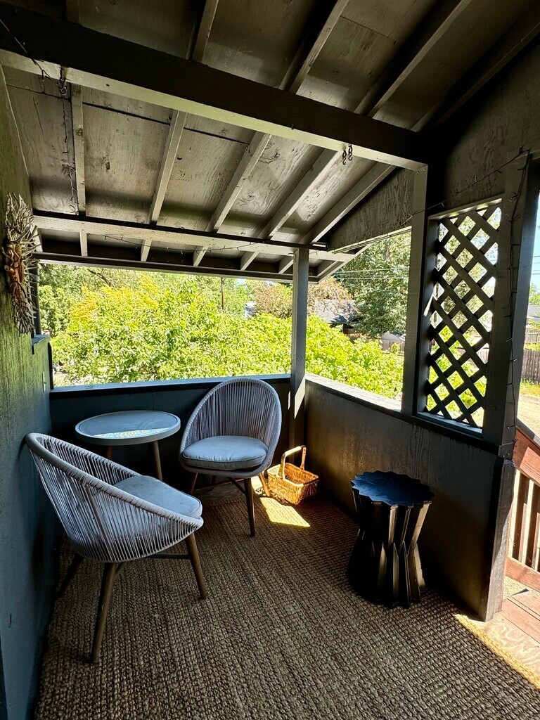 (Utilities included in price) This is a sweet end-of-the-alley hideaway. Furnished 2-floor studio-style apartment available for rent for the right individual. A creatively constructed and designed upstairs abode, located on the 2nd and 3rd floors. The space feels like a unique and tranquil getaway; a space for you to take it easy and unwind. Located just over a couple of miles from the University of Oregon and local sports venues (Autzen Stadium, Hayward Field, Matthew Knight Arena, McArthur Court, etc.), with easy and direct access to the Amazon bike path, this is a great landing spot for drivers and bikers alike. 15 minute bike ride to UO. Available February 1st. 6 month lease preferred, but open to discussion for shorter stays. This is a lovely upstairs unit. It is adjacent to a house, but is its own private home. The entrance to the studio is up a flight of stairs, on the second floor, and the apartment itself contains an upstairs loft (the 3rd floor of the house). There is a private balcony/porch, through which you enter. The main floor of the studio is open floor plan, with a petite yet full kitchen. The upstairs loft is like a cozy nook/yoga & stretching/hangout/movie-watching space. The bathroom is on the main floor and it is a good size. The studio gets nice light, has unique angles, and is really a one-of-a-kind space. It’s a perfect spot for the right person. It comes furnished and decorated (unless specific arrangements are made, you bring your own bedding & towels), but if you’d like to bring your own artwork and change things up, that is totally OK. $1550 monthly includes all utilities. Well-behaved Animals are welcome, per discussion and with a fee. $750 deposit $150 cleaning fee No smoking indoors. There is no laundry on site. Reach out with details about who you are, what you are looking for, contact info, and when you are available to come take a look.