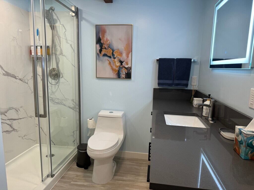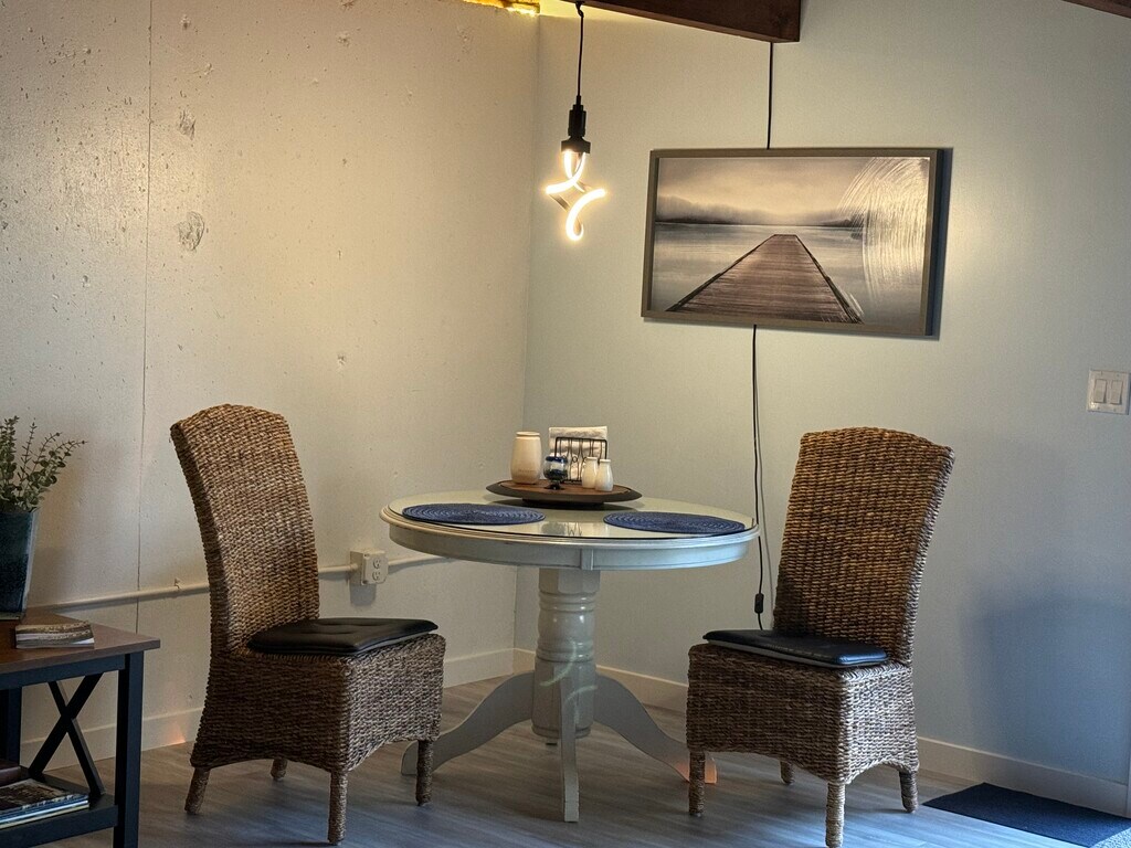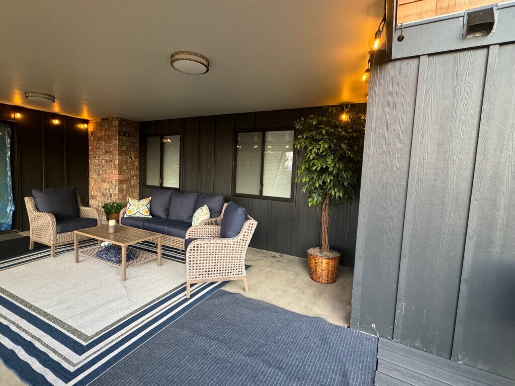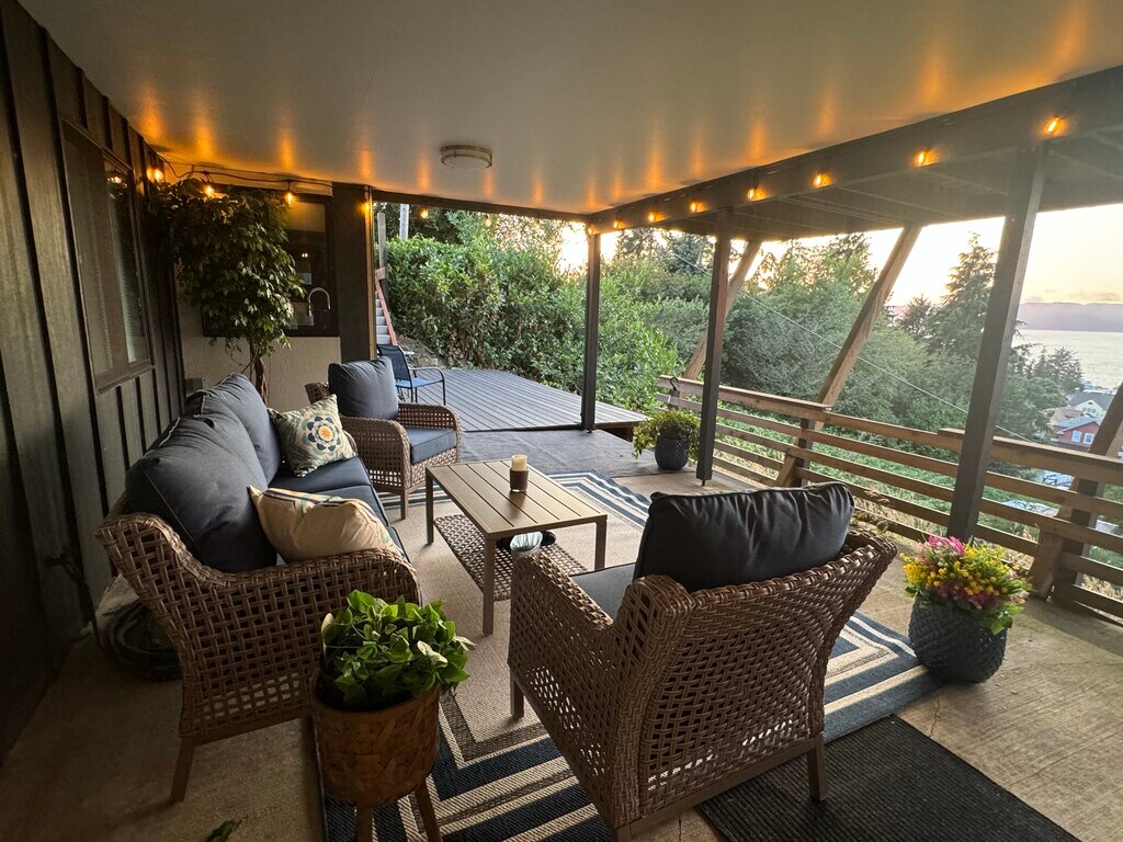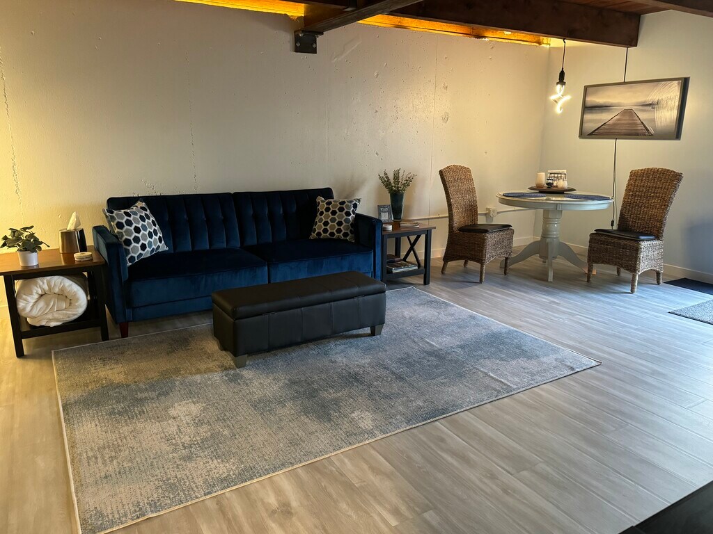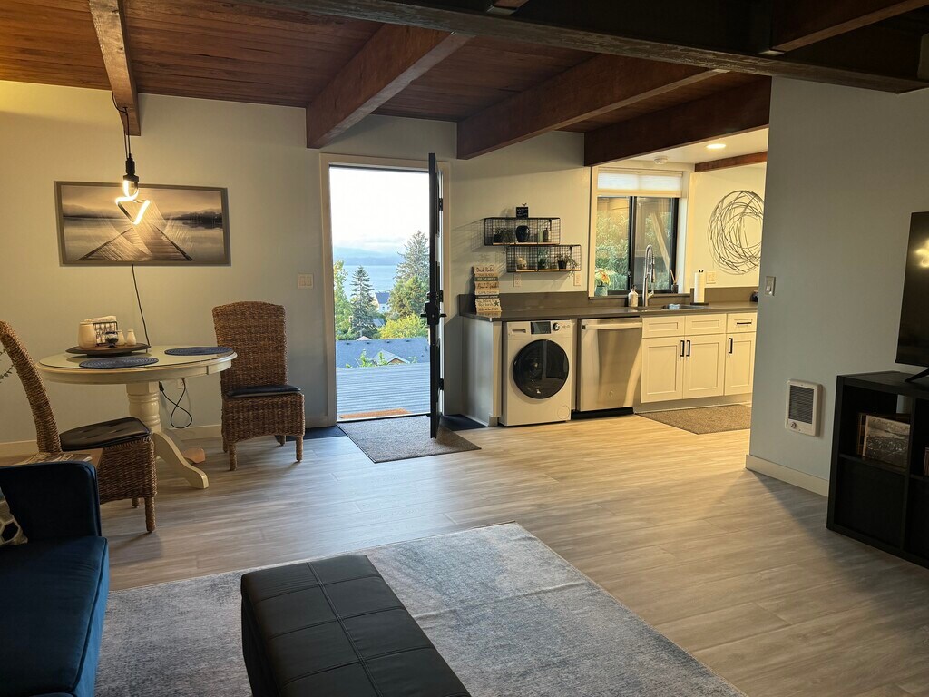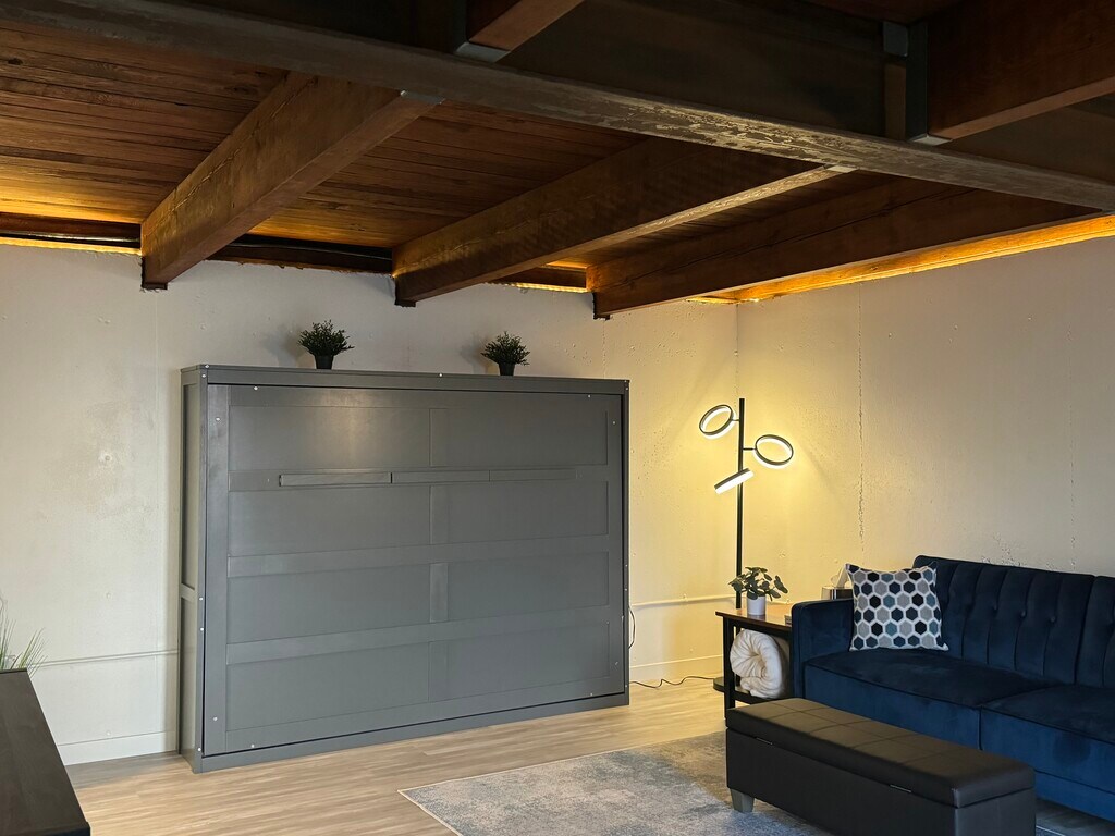 448 Square feet on the Bottom Floor with private access and complete privacy. There is a Murphy bed, full kitchen, full bath, dining table, and couch, everything you need to move right in. There is an open-air deck of approximately 360 square feet. In addition, you will find a covered patio of similar size.