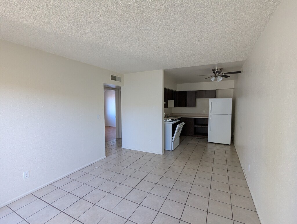 Adorable freshly painted, 2-bedroom 1 bath apartment with ceramic tile floors throughout. It has a huge open great room, with a nice corner kitchen, and room for a small dinette and it has a newer refrigerator. There are dual closets in the bedrooms. Nice private fenced patio. There is a small storage shed located near the laundry room. Water and trash removal services are included. There is an on-site coin operated laundry for tenants. Close to shopping, parks, schools and more. Not far from freeway access: US60 and Loop 101. Alma School/Warner. No Dogs. Non-smoking. Please inquire about our pet policy, move-in costs, availability and move-in special.