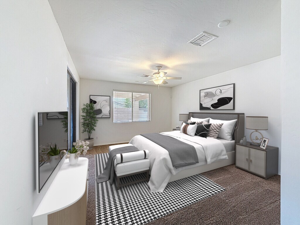 Discover the Golden Heritage ''Estrella Model'', a stunning single-level rental home in Goodyear, AZ, featuring a bonus room and a 4-foot garage extension. This spacious and meticulously maintained residence, cared for by its original owner, offers an exceptional living experience perfect for families or those who love to entertain. Property Features: Spacious Layout: Five generously sized bedrooms, a grand living room, and a beautifully designed family room ideal for gatherings or relaxation. Gourmet Kitchen: Equipped with a large island and a cozy breakfast nook, perfect for casual dining and meal prep. Year-Round Outdoor Living: Enjoy a south-facing extended patio, ideal for outdoor activities.