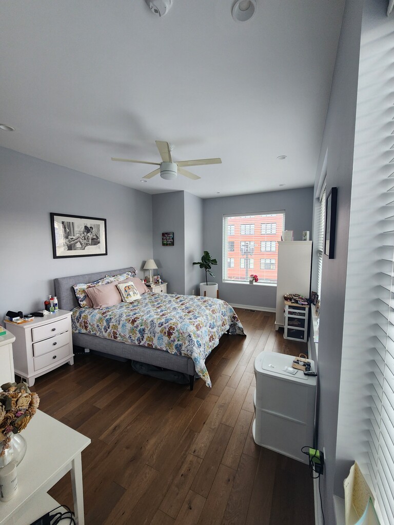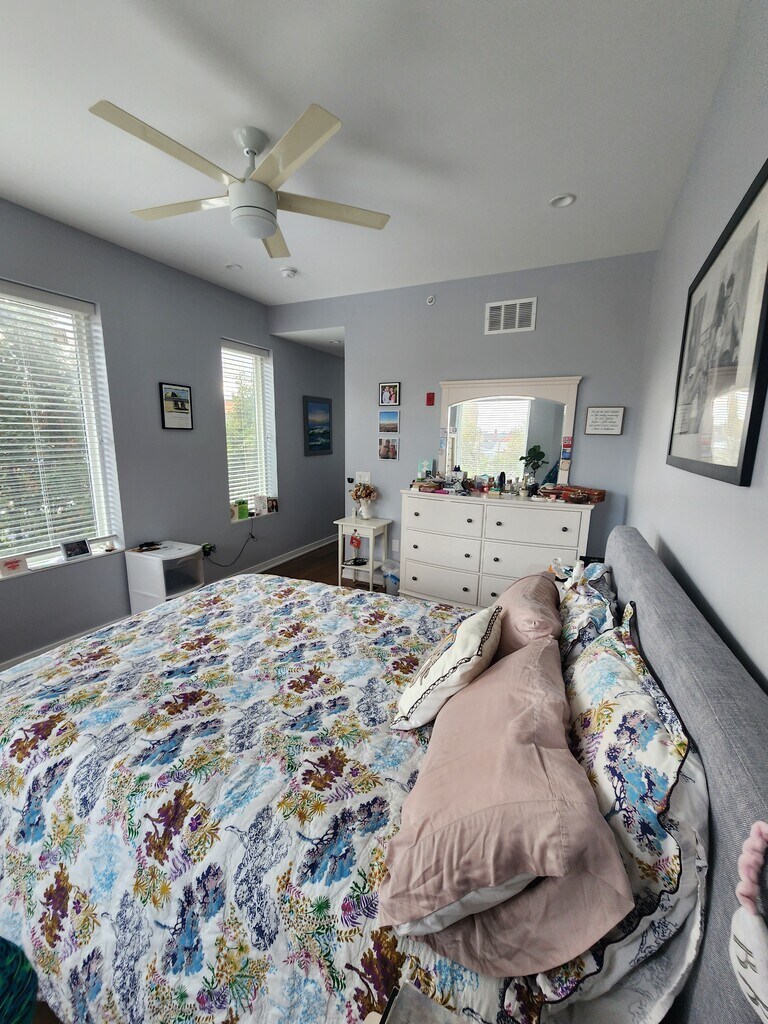 Come live in the heart of Olde Kensington, surrounded by diverse gyms/fitness studios, restaurants, bars, places of worship, salons, dry cleaners, a 7 minute walk to the grocery store, 10 minute walk to Girard Septa, a bus stop at the corner, and 2 blocks away on both sides from nearby parks. Walk up one flight of stairs from street level to inhabit the 2nd & 3rd floor of the building. Enjoy the Boulevard style esthetic of American Street's newly renovated bike/scooter/pedestrian lane. Custom built in 2018, experience modern living with an abundence of natural light in this 2 floor condo. Overhead lighting in all rooms and tons of outlets throughout the home, this space was created with convenience in mind. Open concept living, the kitchen and dining area flow into a spacious living room. The peninsula is great for eating, cabinet storage, complete with sink & dishwasher. Enjoy ample cabinet space, fridge with filter water & ice maker, gas stove, microwave, and range along a modern beveled backsplash with stylish brass fixtures. Deep pantry complete with spice racks & 4 shelves provides incredible space to house groceries. All rooms have custom blinds pre-installed and a curtained off balcony area outside the sliding door on the 1st floor. The entrance hallway offers some extra storage in HVAC closet with a separate coat closet to keep your place looking tidy. Downstairs bedroom has massive closet. Ceiling fan and massive window for more inspiring natural light. Ample wallspace to decorate as you want. Peacefully painted a calming summer blue, the downstairs bathroom offers bathtub and shower. Room for addition storage. Good for family and baby. Outside balcony offers a sunshine ladden view of Olde Kensington and a vantage point to enjoy the buzz of the neighborhood. Lots of outdoor concerts occur next door at Punch Buggy Brewery and street festivals during Fall/Summer. Ample free street parking for guests, but protected Permit parking ($75/yr thru city) on Jefferson Street for residents of 1500 N American and our neighbors on Jefferson ensure you're not circling for parking in what can be perceived as a busy area. Up a flight of stairs, enjoy the privacy of a massive primary bedroom, twin vanity bathroom, huge beautifully tiled shower, linen closer, walk-in closet with overhead shelving, and office nook with shelving. Bathed in natural light the 2nd floor is a sanctuary in and of itself. Quiet between 1st & 2nd floor makes for an ideal setup for a family needing space from another or busy professionals sharing living/working space. A downstairs caged storage unit in the basement makes seasonal changes easy. We are taking the shelves but highly recommend having shelves in the storage unit to maximize space. Dual entrances are secure with a code for front door and a side gated arstorage. sharable code that allows packages to be delivered safely (you must give directions to UPS/FedEx/Amazon to use gate on American St) without permitting access to the inner building itself. In the gated area, we have bike racks for year-round athletic storage. We still recommend a kryptonite lock for bikes. This area is also pur garbage collection area. HOA includes trash removal, monthly cleaning of common entrances and hallways, and snow removal during winter.