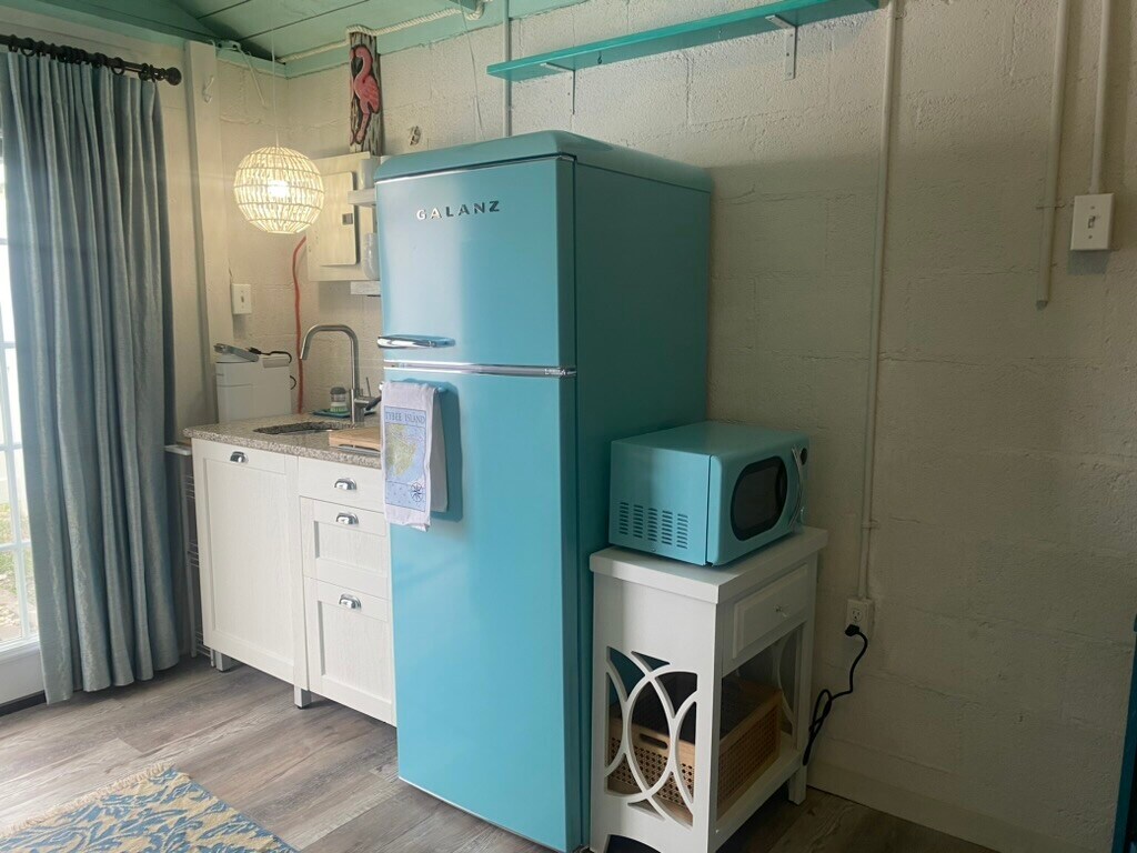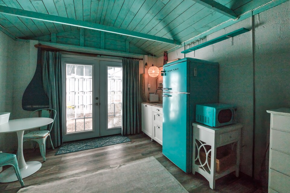 This is a delightful, updated beach cottage studio with a full bath, queen size bed, kitchenette, and private outdoor patio with grill. Long term rental (3-12 mo) preferred. The fully furnished space includes includes a sweet little couch, chair, ottoman, two tables (one indoor, one outdoors) a small dresser, and a place to hang clothes. The bed includes four very large pull-out drawers for convenient, hidden storage space. The small couch pulls out to add an additional twin-size bed. The kitchenette is tiny, but it has a full fridge, convection cooktop, sink, and microwave. Krups coffee maker, toaster, plates, bowls, glasses, mugs, pots and pans, silverware. On-site free parking. The house sits on a wonderful property with lit palm trees and nice landscaping. Located on a quiet street, the cottage is just blocks from Tybee’s best dining, the pier, and the lively south end. Behind the home, the back river’s Alley 3 offers easy access for paddleboards and kayaks, along with some of the island’s most breathtaking sunset views.