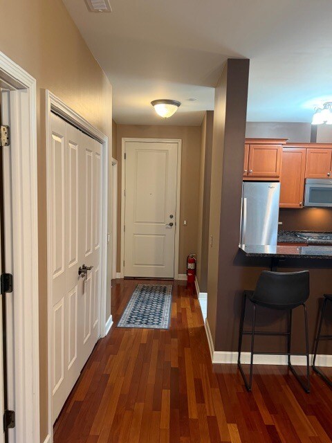 HERE'S YOUR CHANCE TO LIVE IN DOWNTOWN ARLINGTON HEIGHTS! UNIT FEATURES BEAUTIFUL BRAZILIAN CHERRY FLOORS, KITCHEN W/CORIAN COUNTERS AND PLENTY OF CABINETS, BREAKFAST BAR, BEDROOM WITH TWO LARGE CLOSETS, IN UNIT LAUNDRY AND A SPACIOUS 24 X 10 BALCONY. TWO UNDERGROUND PARKING SPACES The Premier Spot for DTA living 2 minute walk to Jewel 3 minute walk to Arlington Heights Train Station 2 Restaurants in the Building Huge Balcony (225 square feet) Stainless Steel Appliances Granite Counter tops Hardwood Floors Inside Building, Heated Parking Storage in the Garage Full time Front Desk Multiple Security Cameras Secured Doors Amazon Packages typically delivered to your door Gas and Water included. Tenant pays Electric. NO SMOKING