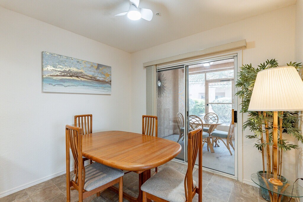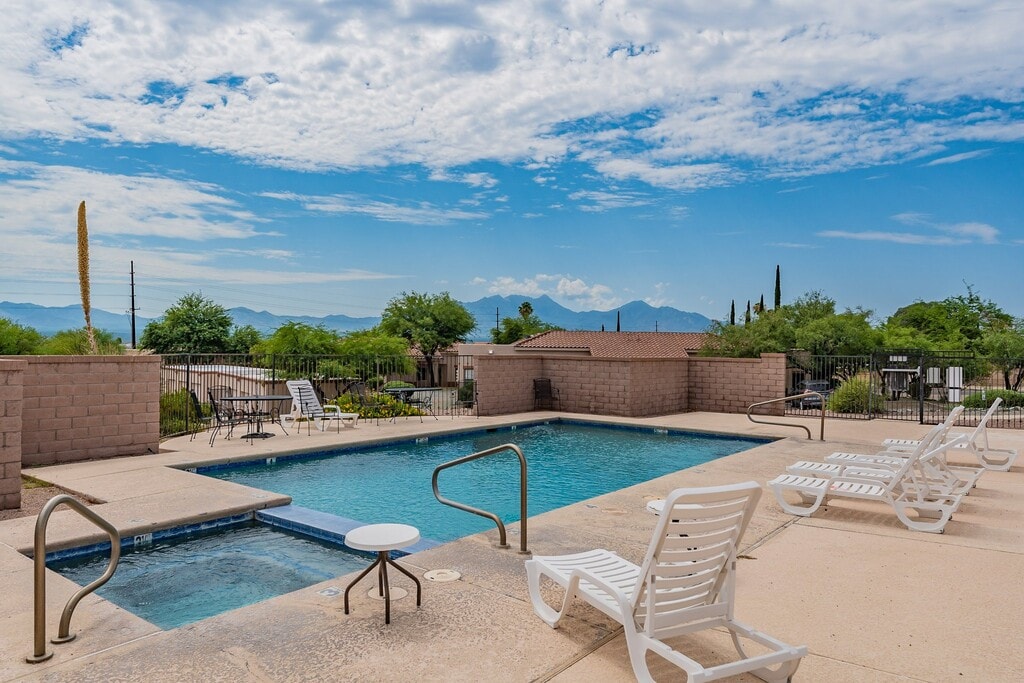 Enjoy Mountain View’s at this single level all ages townhome in Green Valley. One master suite with shower with queen bed, desk, large dresser and walk in closet. Second bedroom has two twin beds, desk and smaller dresser. The full kitchen has plates, silverware, cookware, Ninja single cup or full pot coffee maker and air fryer toaster oven. There is an indoor dining room with table and screened in porch (Arizona Room) with table for seating indoors or partial outdoor. The community pool is not far and gated. There is one covered parking spot included, plus plenty of open parking not covered. Minutes to Tucson, Tubac, shopping and the border to Nogales, Mexico. Fully furnished and equipped. All utilities included with cap. AC and ceiling fans in every room.