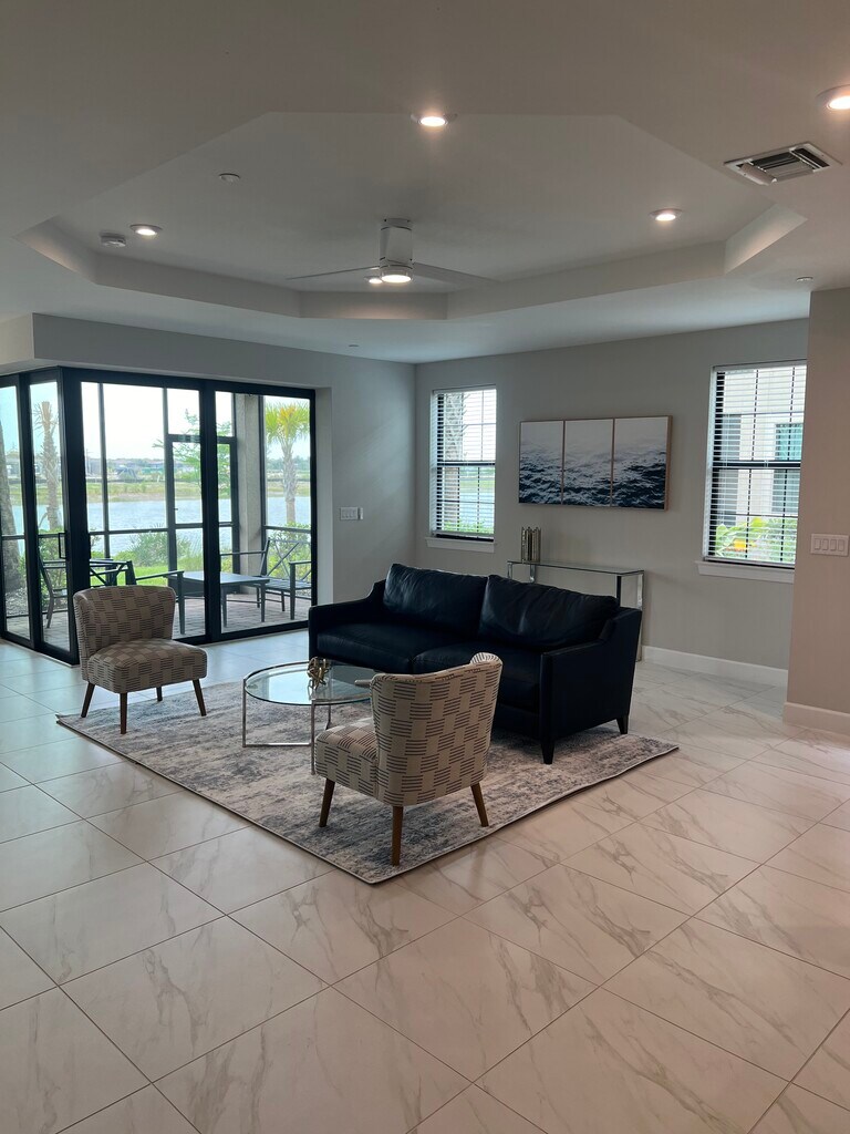 FURNISHED Brand New 2 BR, 2.5 Bath Plus Den First Floor Coach Home with 1 Car attached Garage - With En-suite Guest Bath Recently constructed 1st floor coach home located at Esplanade by the Islands. This coach home has over 1950 SF of living space plus a screened in lanai overlooking a long water view. Located in a gated community and conveniently located near Publix. Features brand new appliances, spacious laundry room, fully tiled floors, attached garage and screened in lanai. Community pool located just steps away.
