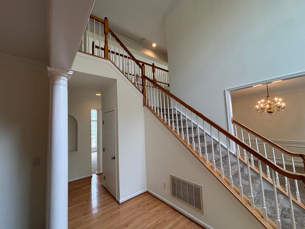 Nice home in Ballantyne with open floor plan and a catwalk. Whole house was Freshly paint and new carpet throughout. The open-concept kitchen, dining/sunroom, and two-story great room form the home’s heart, featuring granite counters, stainless steel appliances, a large island, breakfast bar, and walk-in pantry. Sunlight pours into the dining/sunroom through expansive windows, creating warm ambiance. A first-floor bedroom with a full bathroom offers flexibility. There is also a Livingroom/office and Dining room on the main. Spacious primary bedroom with trey ceiling and walk-in closet. Large primary bathroom even has a whirlpool. Three more secondary bedrooms and a hall bath upstairs. Hardwood floors in foyer, kitchen, breakfast area, and powder room. Brand new deck on the back Nice size for light entertaining and a nice back yard with room to play. Laundry shoot is in one of walk-in closets in the primary bath. Both walk-in closets have extra storage area - great for luggageWasher, Dryer, Refrigerator provided. Knights View is for K-4th Grade. 5th Grade will attend Elon Park. Community House is 6-8th Grade.