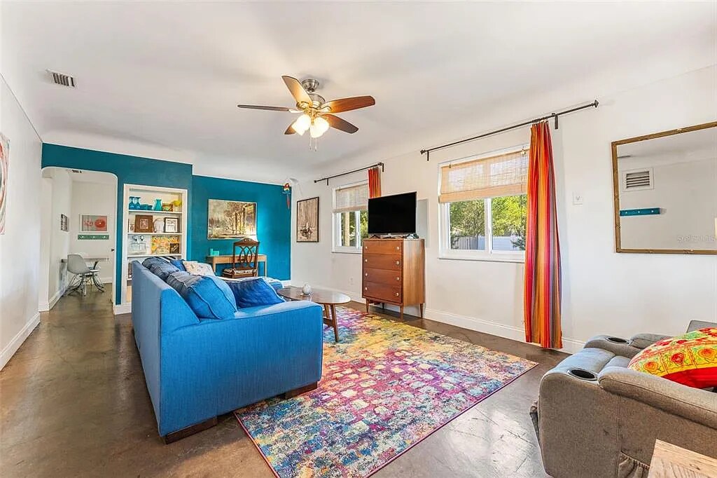 Welcome to your fully furnished Gulfport home: a vibrant mid-century 2-bed/1-bath duplex unit full of personality, comfort, and artistic spirit. Located just minutes from the Waterfront Arts District, famous Gulf beaches, and downtown St. Petersburg, this thoughtfully designed space is ideal for anyone seeking a charming, move-in-ready rental in one of Pinellas County’s most beloved neighborhoods. The home includes two furnished bedrooms (one king and one double), one full bath, stained concrete floors, a bright living area, a fully equipped kitchen, central HVAC, a private fenced yard, a private entrance with no shared walls, shared laundry on-site, and off-street parking. Pets may be considered. Internet, water, and sewer included. Tenant pays electric.